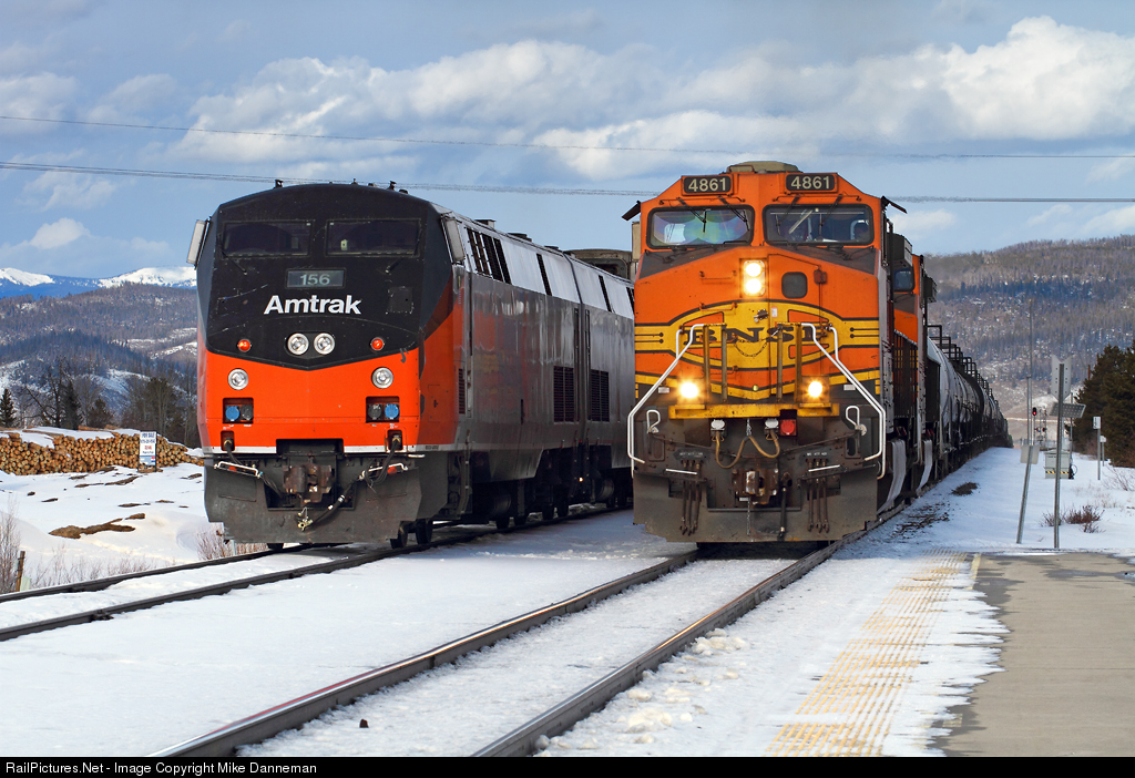 An eastbound BNSF manifest freight passes by Amtrak’s Winter Park Express ski train tied down in the siding at Fraser, Colorado, on January 20, 2018. The 2018 edition of the WPE utilized Amtrak’s “Phase I” heritage unit No. 156 as one the the locomotives, with the power running around the train at Fraser due to the wye at Tabernash being out of service.