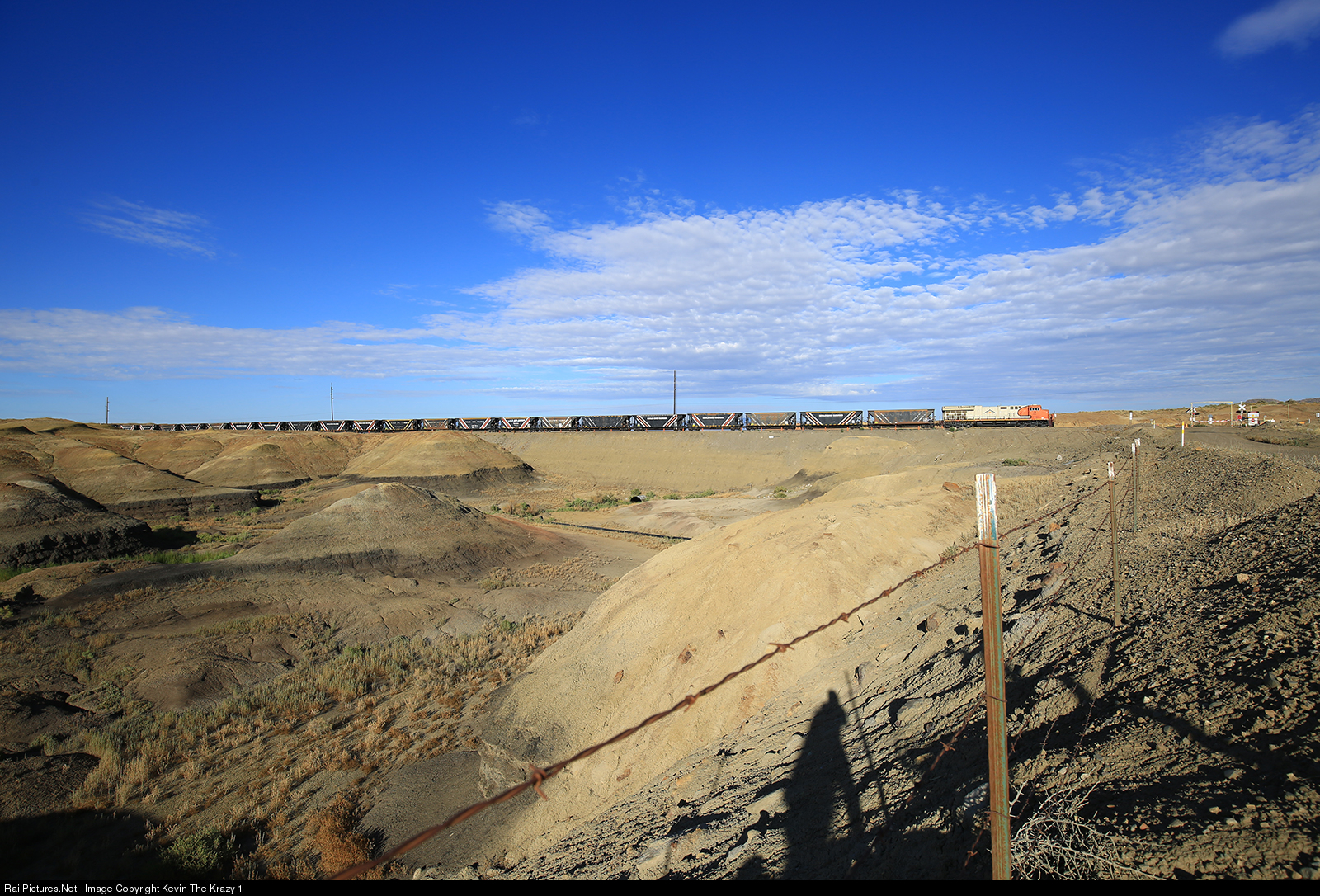 | A Navajo Mine ET44AC is seen pushing another empty train across Table Mesa Road which is the only public road that crosses the 13.8 mile long mainline. The train runs all day Mon-Fri so it was a pretty easy catch with a little patience. The E60s and wire is now gone, but the railroad still uses a C425 dummy on the south end of the train. |