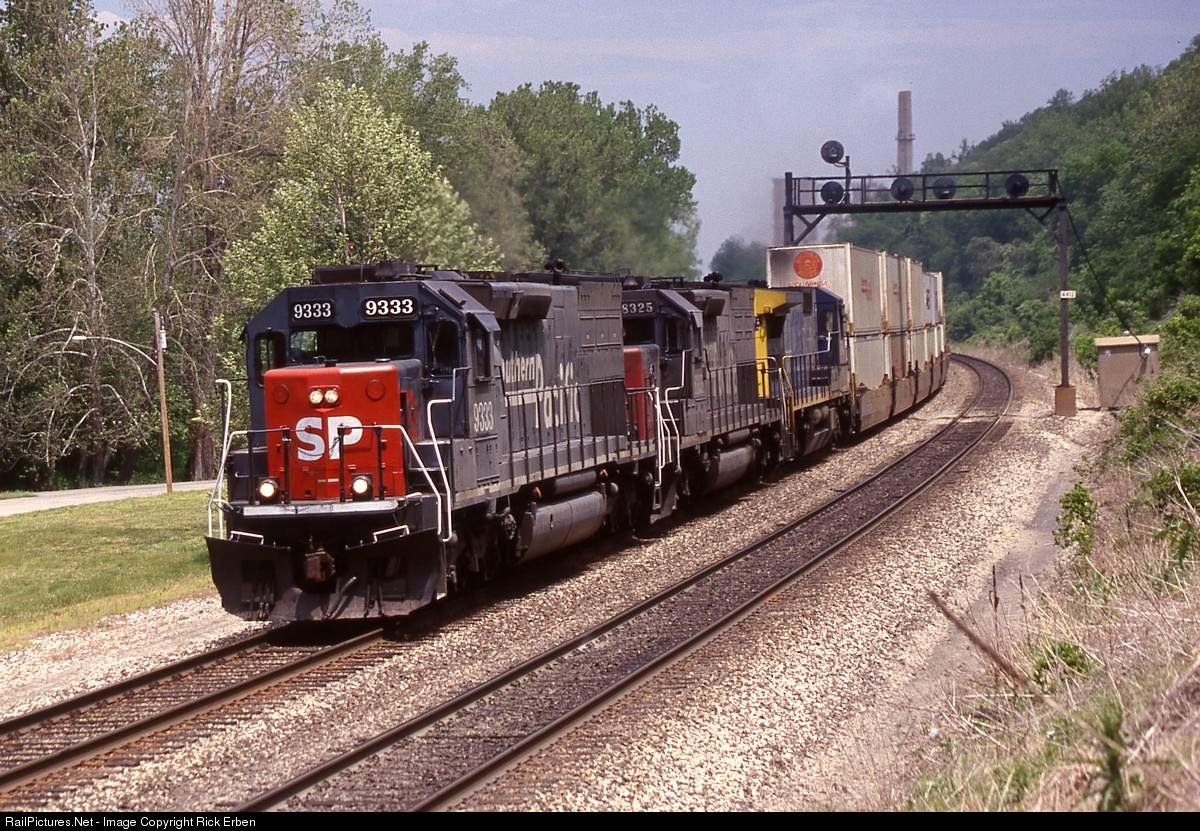 Espee was no stranger to the Kansas City area, using ATSF and UP tracks east of KC and former Rock Island and MoPac tracks toward Tucumcari and Pueblo, respectively. The signal bridge says "Santa Fe" and this is a westbound using rights over the BNSF (nee AT&SF) as it approaches the terminal area. The 9333 was perhaps the cleanest SP unit on the roster at this point in time.