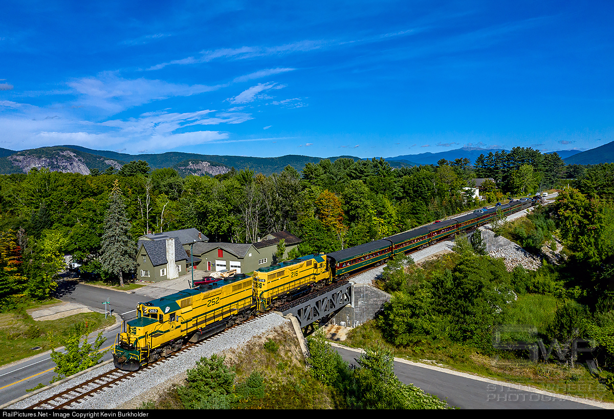 | Rare mileage but home for the 252! Conway Scenic Railroad's Railfan Weekend included an end-to-end trip on the company-operated former Maine Central Mountain Division trackage. After departing North Conway Depot, the train headed for Mountain Jct. with CSRX 0-6-0 #7470 leading north/westbound. At Mountain Jct., the CSRX former Maine Central GP38 252 and accomplice CSRX GP35 216, led the train to the eastern end of the CSRX-operated Redstone Branch (former MEC Mountain Division) in Conway. The train is seen rolling out of North Conway with the pair of EMDs leading the southbound rare mileage trip with Mount Washington standing tall in the background. |