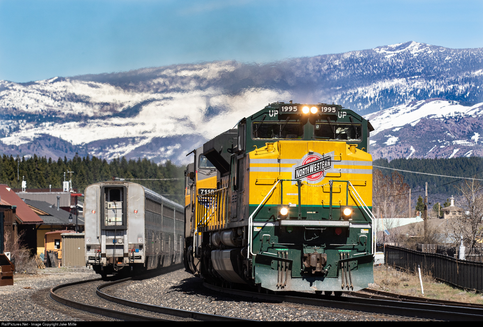 | "Highball the 1995." On a clear spring afternoon, Union Pacific 1995 (the Chicago & Northwestern heritage unit) rockets westbound out of Truckee while Amtrak's California Zephyr pulls in for a station stop. Truckee is an awesome place for both novice and experienced railroad photographers. With easy access to downtown and beautiful mountain backdrops in every direction, any photographer can stay busy watching the usual train traffic head on and off the hill.