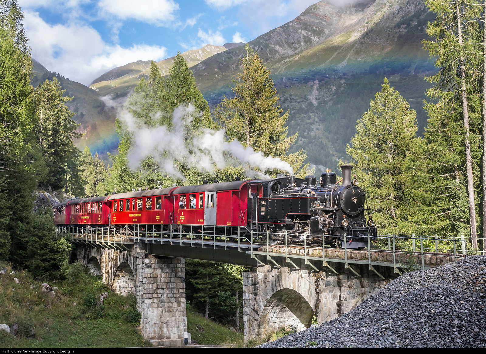 Steamtrain of the Dampfbahn Furka Bergstrecke with cogwheel locomotive HG 3/4 # 4 is crossing the Lammen viaduct between Gletsch and Oberwald, with a rainbow in the background.