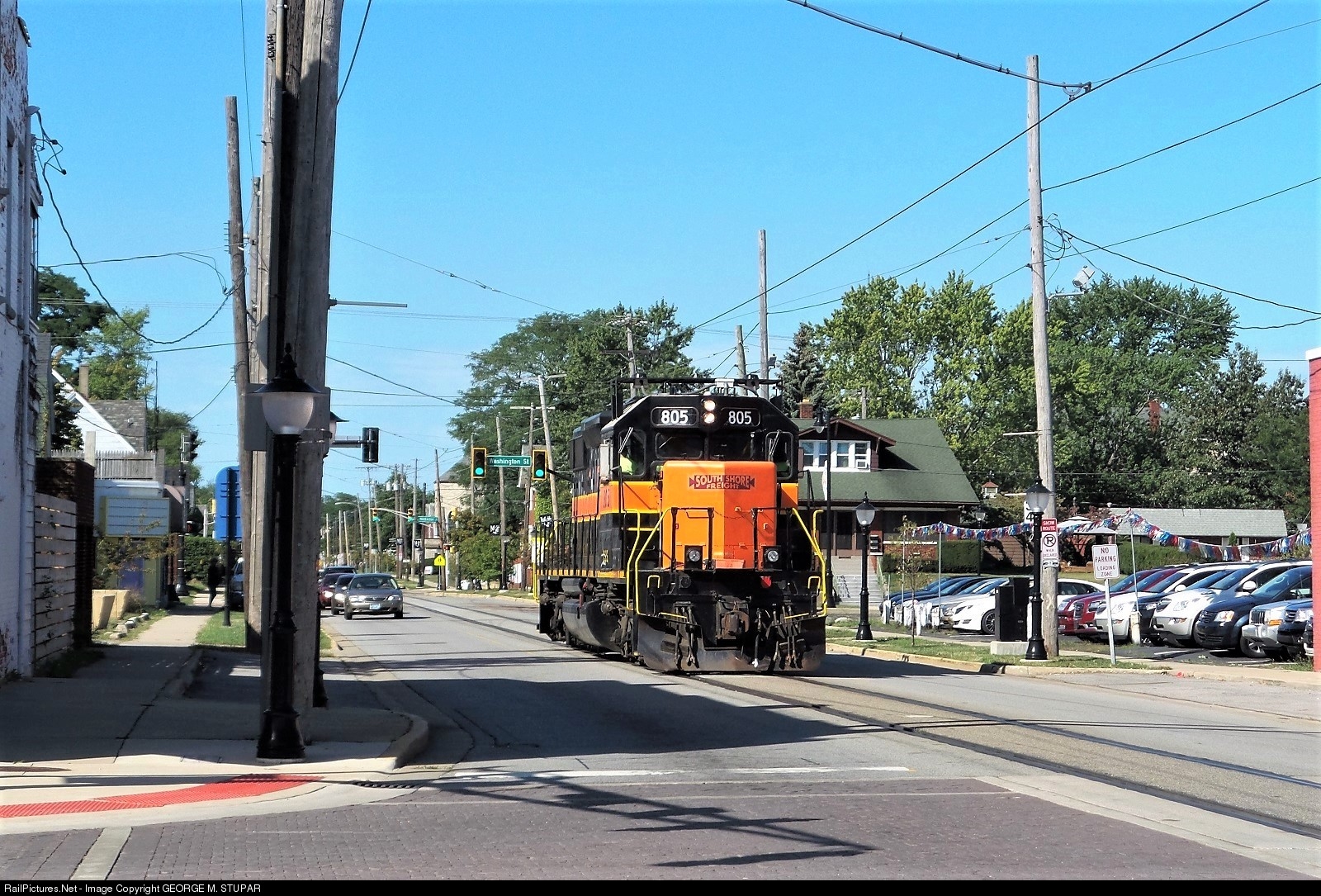 SD38-2 805 is seen cruising down 11th street, on the South Shore Line, under NICTD catenary wire.