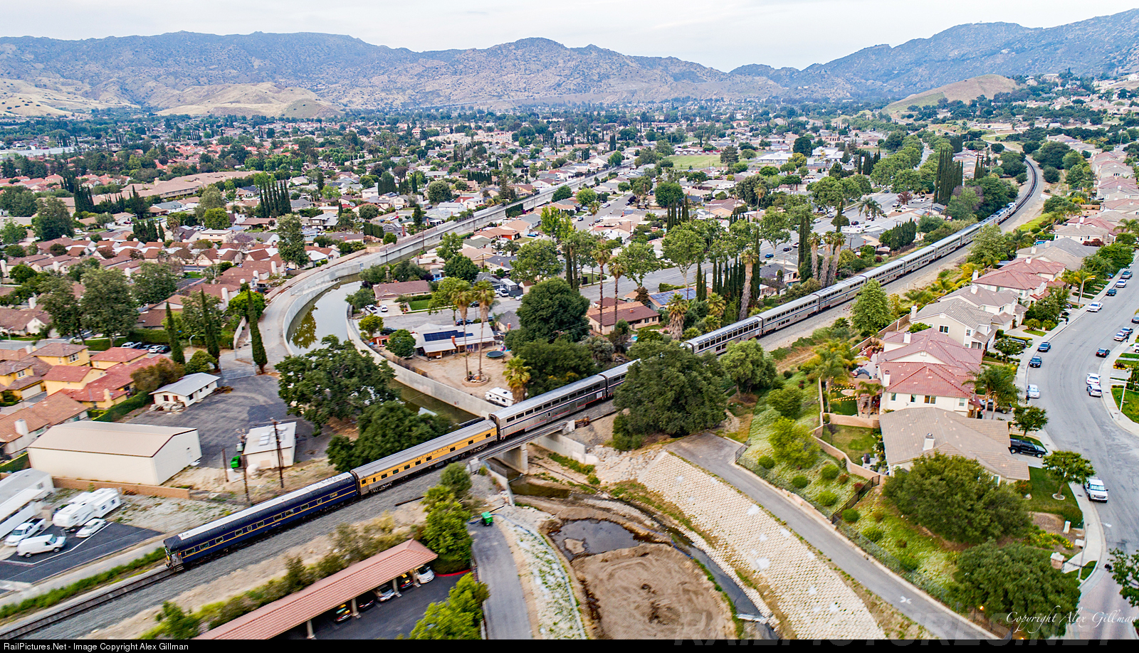 LARail.com's private cars "Pacific Sands" and "Tioga Pass" bring up the markers of this evening's passage of the southbound Coast Starlight as the train banks to the east on its approach to Santa Susana Pass.