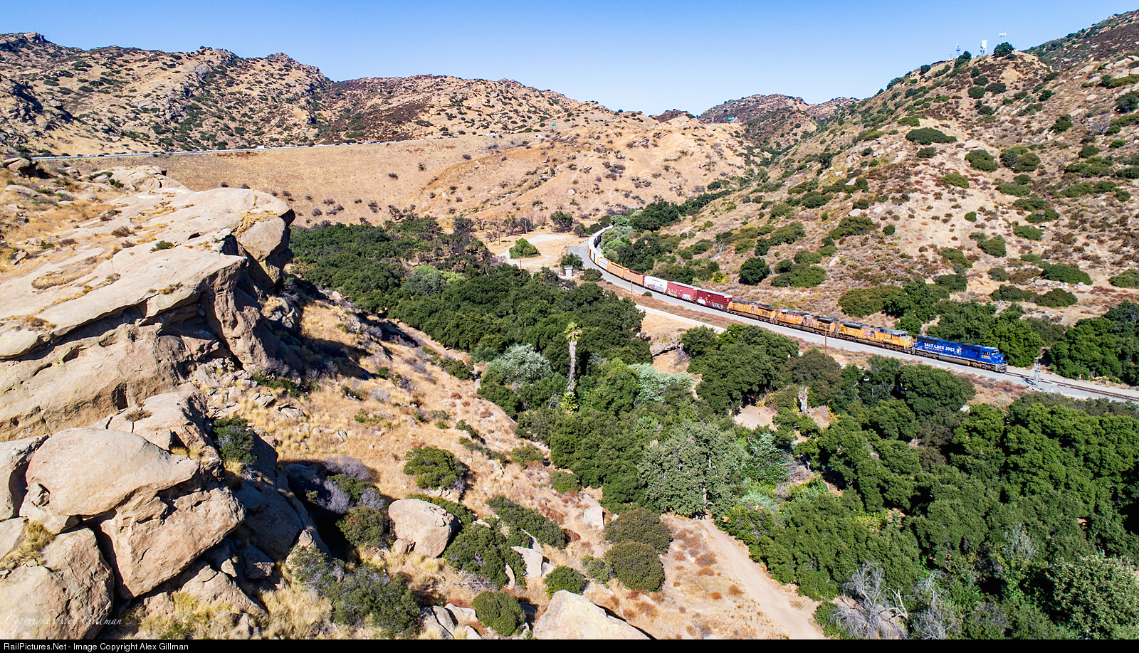 | Having traveled over a mile inside Tunnel 26 (located just around the corner where the train is coming out of the hillside), UP 2002 leads the Oxnard-bound LOF65 into Simi Valley on a hot, summer afternoon. |