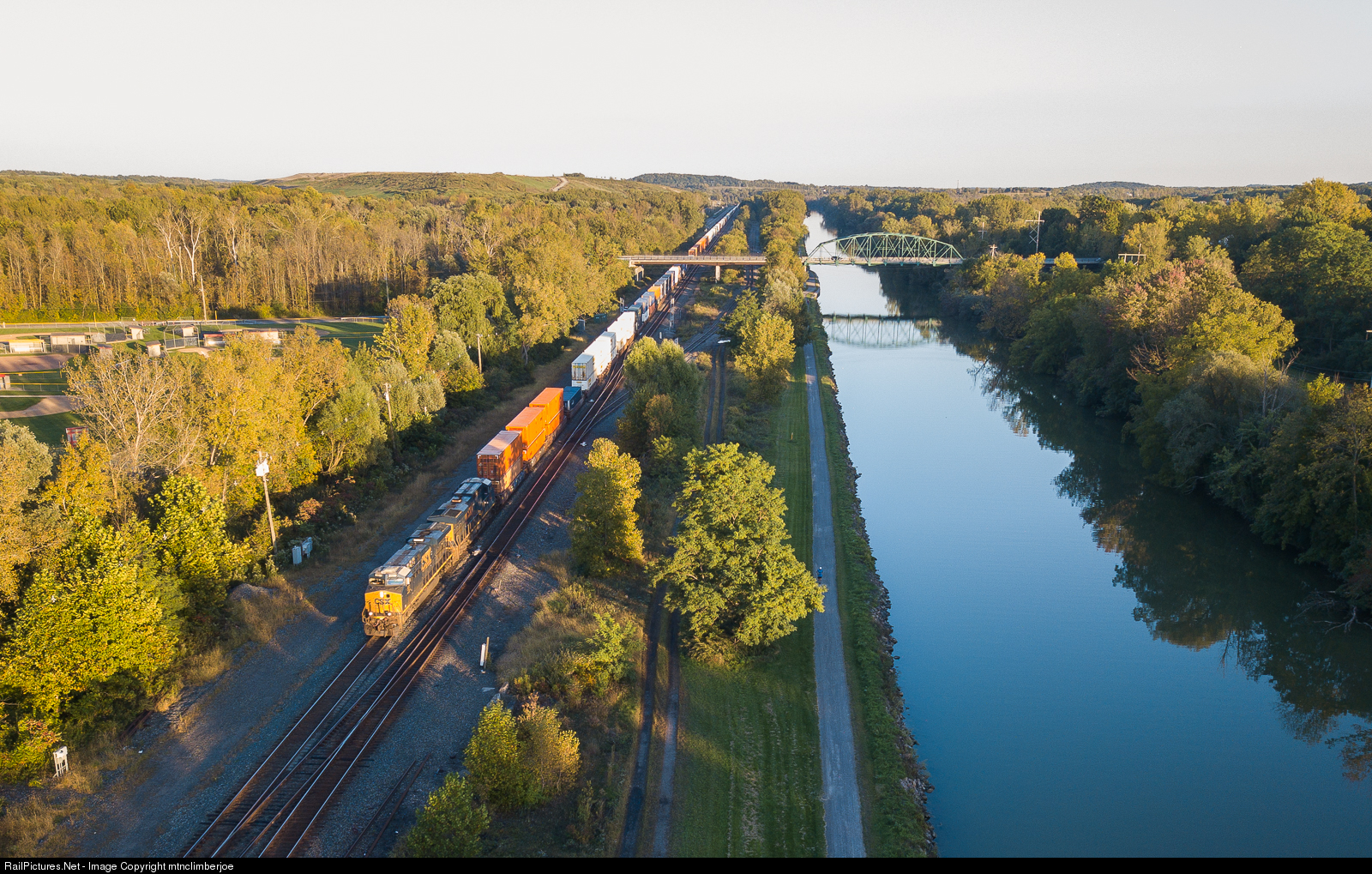 | CSX intermodal Q003 heads west alongside the Erie Canal at CP 359 in Perinton, New York. A pair of GEVO's are in the lead, catching the last rays of the September sun. |