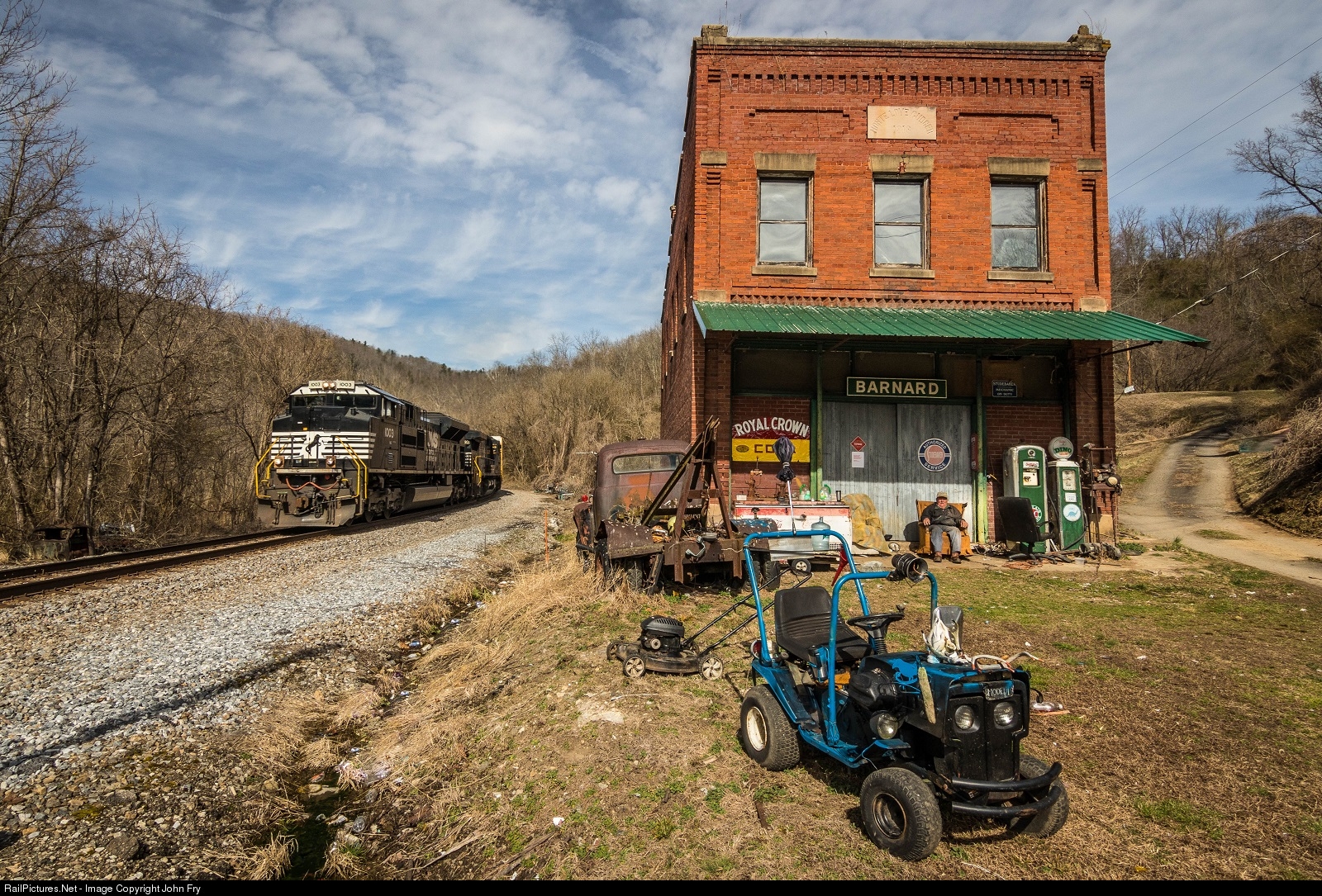 | New passes old. Train 123 heads east through Barnard, NC on its way up to Asheville. Barnard used to be a busy little town with a passenger depot for vacationers. Now, all that remains is this building with little of anything new other than a "Mad Max" riding mower. |