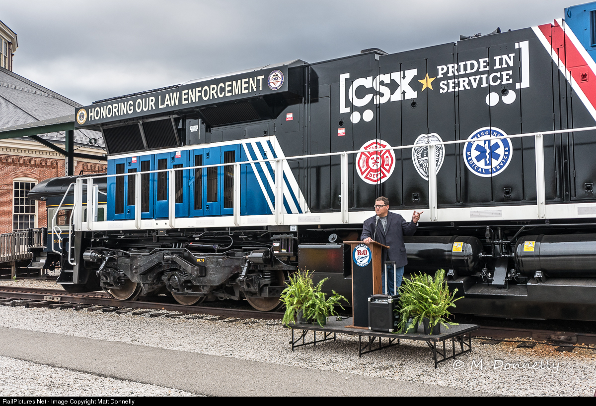 On display at the B&O Museum for First Responders Day, CSX's Eric Hendrickson speaks about the commemorative locomotive and kicks off the day's activities.