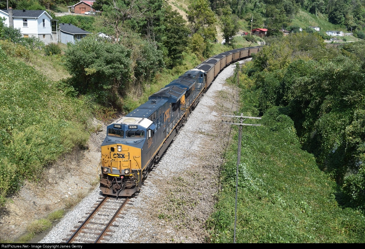 | After finishing loading coal on the far end of The Carr's Fork Branch in The Yellow Creek community of Vico, CSX 3326 leads loads under KY 451 en route to Hazard Yard along the last remaining miles of The Rockhouse Subdivision.