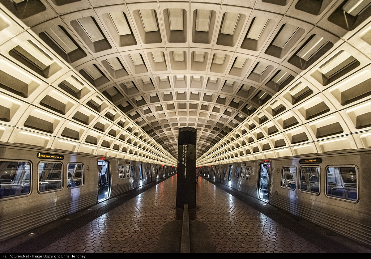 A yellow line and a green line train make their stops at Archives/Navy Memorial on their way to Reagan Airport and Greenbelt respectively. The high vaulted, waffled, symmetrical ceilings of the downtown Metro stations are always pleasing to the eye, adding greater detail to this subway scene.