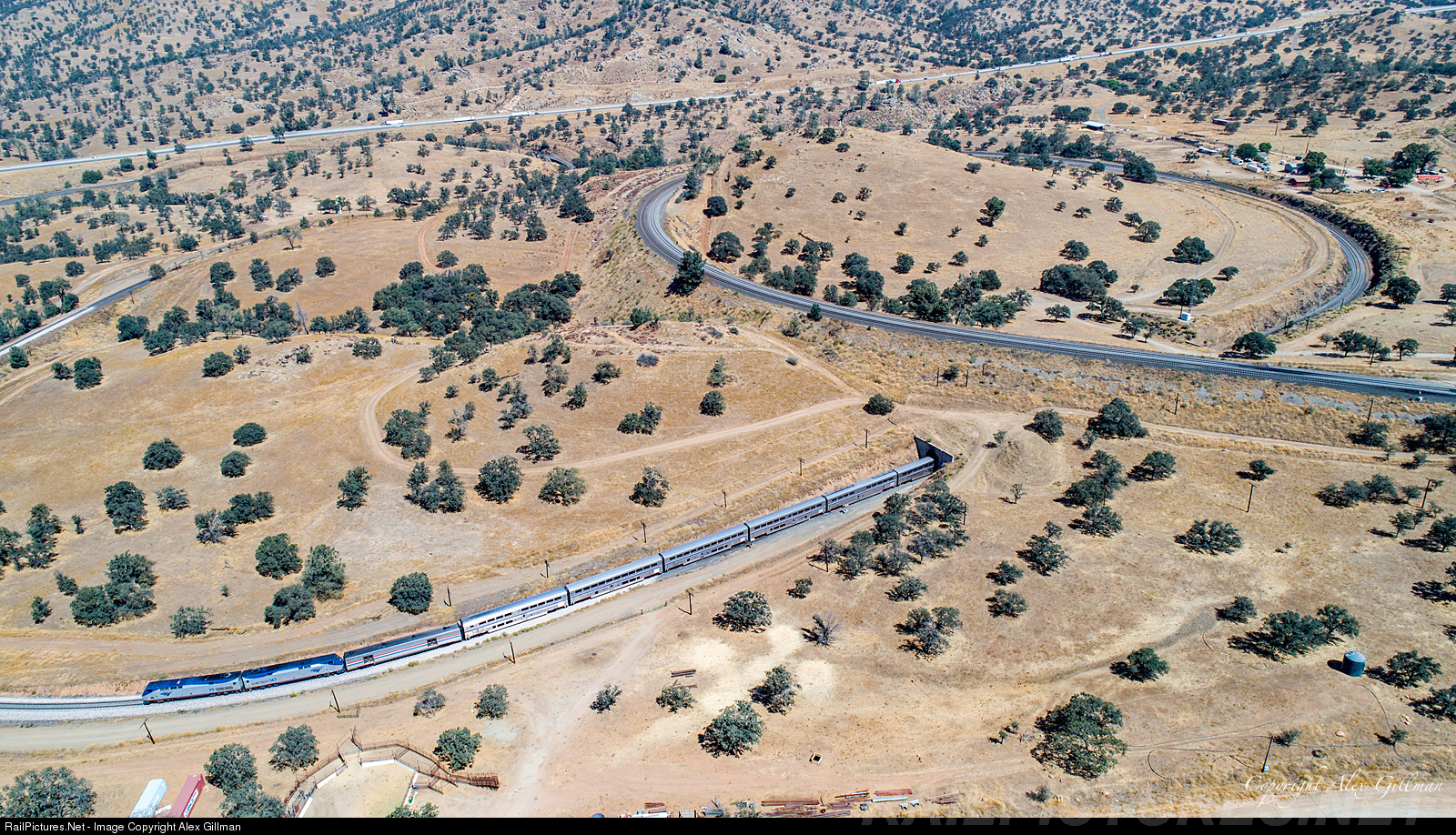 Passenger Service Returns to "The Loop." Amtrak 14, the northbound Coast Starlight, eases through Tunnel 9 as it exits the world famous Tehachapi Loop on a hot summer afternoon.