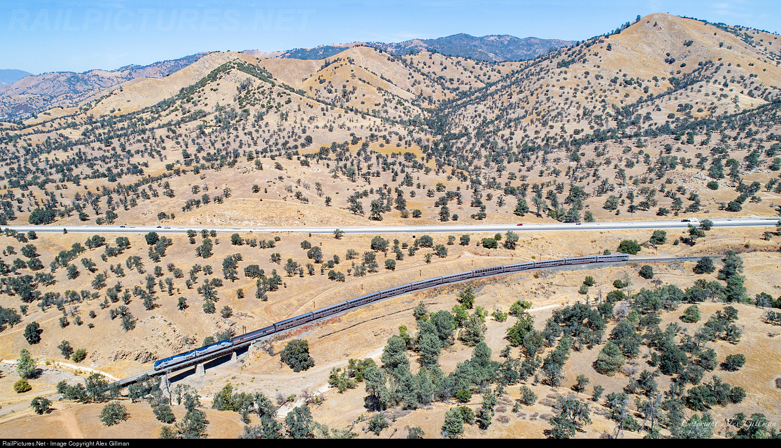 | Amtrak 14 approaches the south end of Woodford siding as it makes its way across the 4th crossing of the Tehachapi Creek riverbed on a warm, summer's afternoon. On days like this it's hard to imagine how different Woodford was some 87 years ago on September 30, 1932, when a deadly flood swept down the pass - taking multiple lives and toppling 200 ton steam locomotives into the raging waters. |