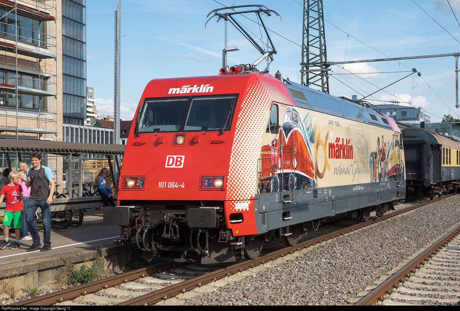 | Electric express train locomotive 101 # 064 of the Deutsche Bahn with a publicity paint scheme for 160 years Märklin model trains. For the 160th anniversary of the company, a publicity locomotive was commissioned at DB. Since 1 July 2019, the 101 # 064 drives in a neat Verklebung by Germany. The motif of the Werbelok represents a journey through 160 years of fascinating company development, from a small tin toy factory to a world-renowned producer of high-quality metal toys. Märklin has been connecting generations for 160 years. This message spreads the locomotive now for the next 12 months across the republic and draws attention to the fascinating history of the company. |