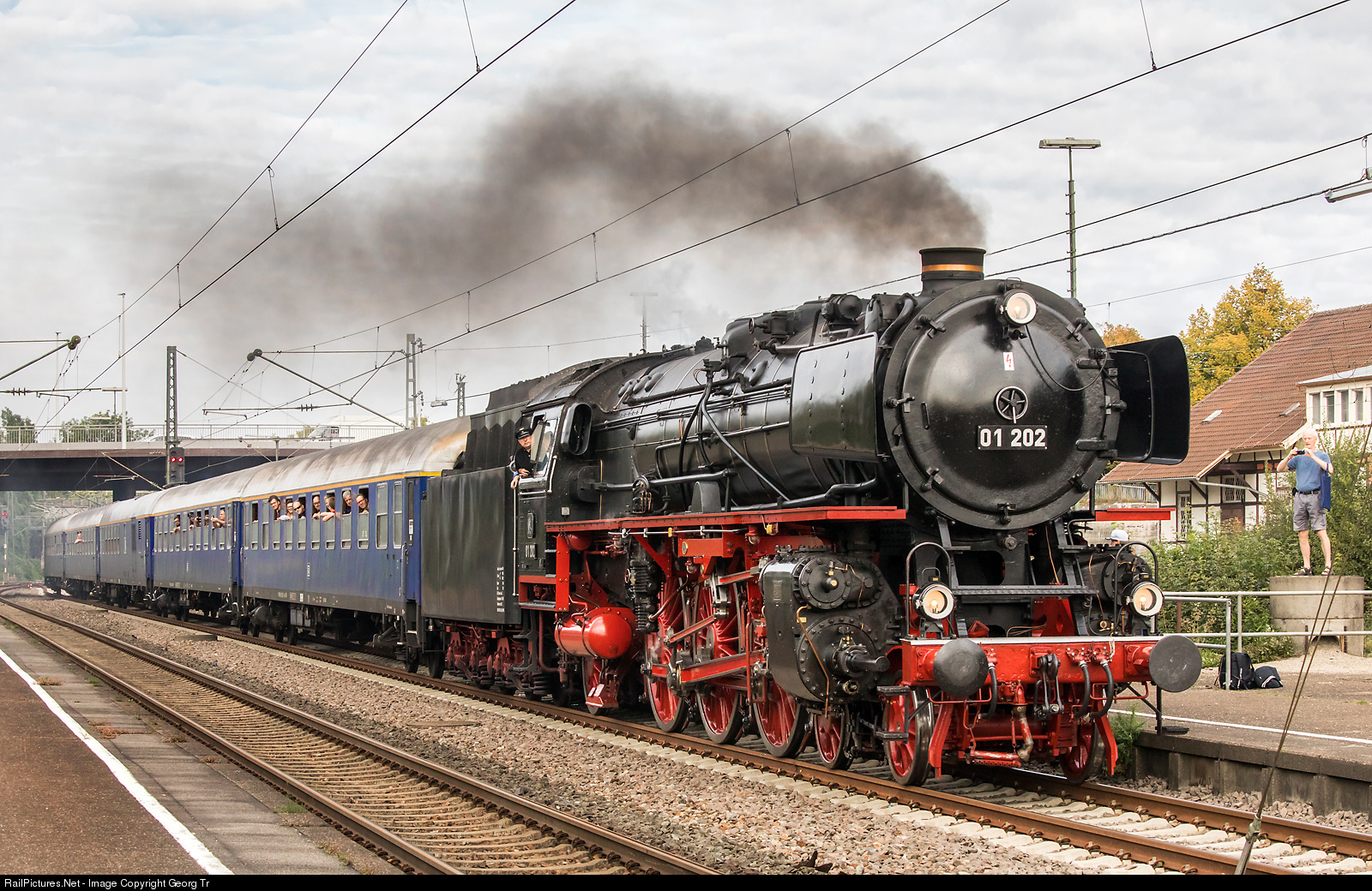 The former Deutsche Bundesbahn 4-6-2 "Pacific" express train steamlocomotive 01 # 202, based in Lyss/Switzerland, is entering Göppingen with a train from Stuttgart Hauptbahnhof, on the occasion of the 12th Märklin Days and the international model railroad exhibition (IMA). The cars are former Deutsche Bundesbahn first class express train cars, now based in Switzerland in Balsthal. The 01 # 202 came from Lyss to Stuttgart the day before, via Basel-Offenburg-Villingen-Rottweil-Horb.