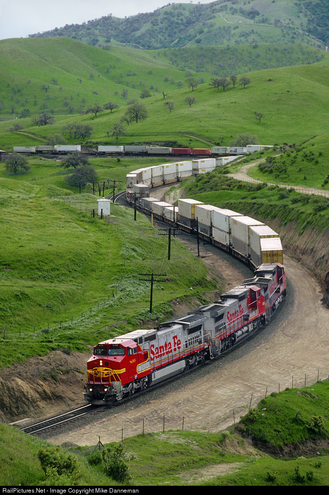 A Santa Fe intermodal train drops downgrade through the curves at the west switch of Bealville siding on California’s Tehachapi Pass route on March 10, 1995. A trio of Super Fleet GE C40-8Ws powers the westbound train led by class engine No. 800.