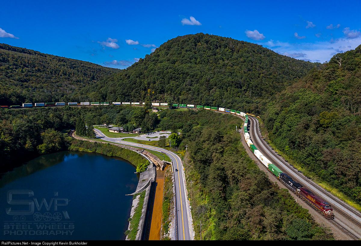 Norfolk Southern train 20R is well into the famous Horseshoe Curve with the Lehigh Valley heritage ES44AC leadingbrhe eastbound intermodal.