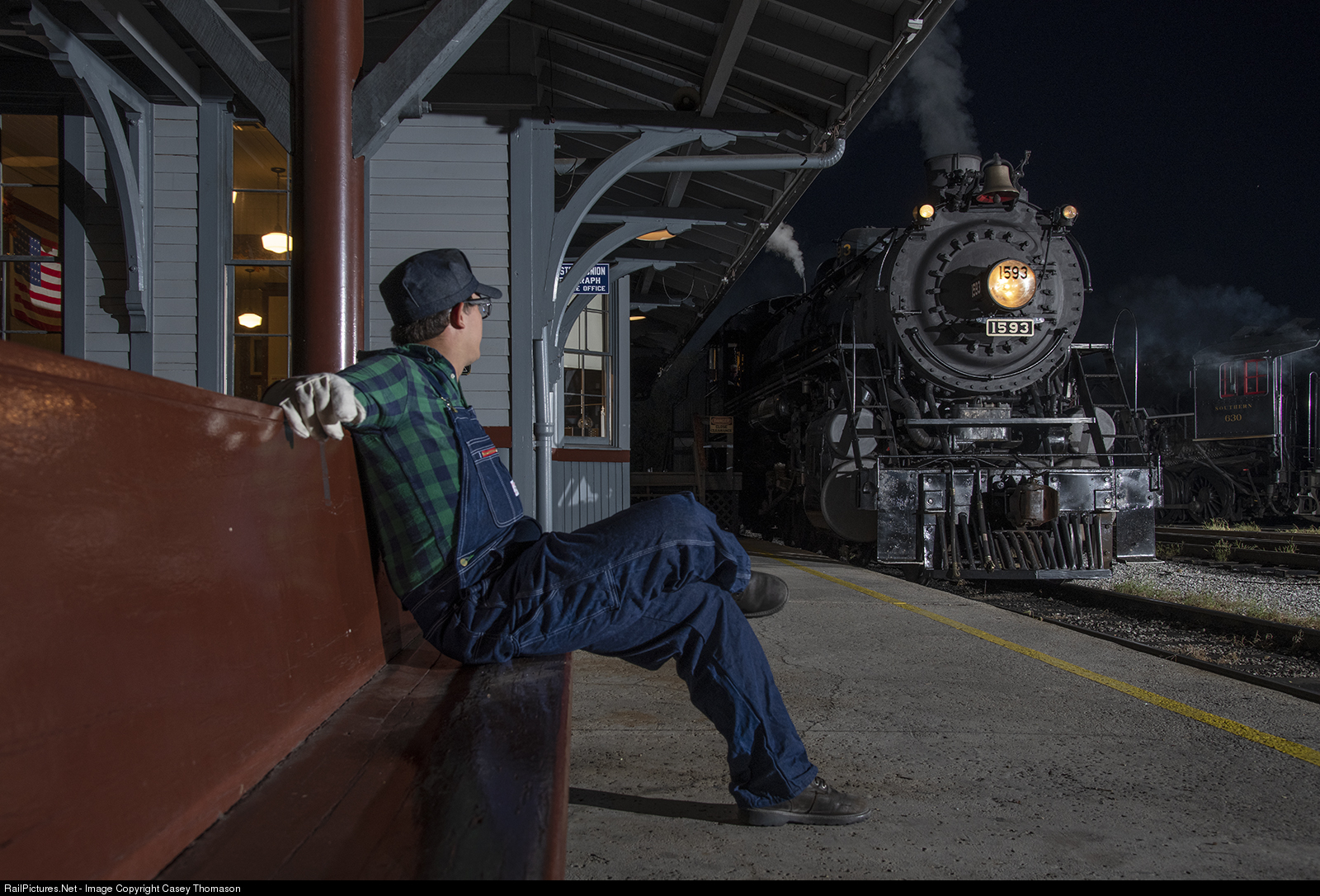 | The next shift fireman for L&N J-3 #1593 watches as the inbound crew eases in to the depot for a crew change. In support of the 2019 L&N Historical Society convention being held in Chattanooga, Tennessee Valley Railroad Museum made some cosmetic changes to Southern 4501 to give it an Old-Reliable appearance. |