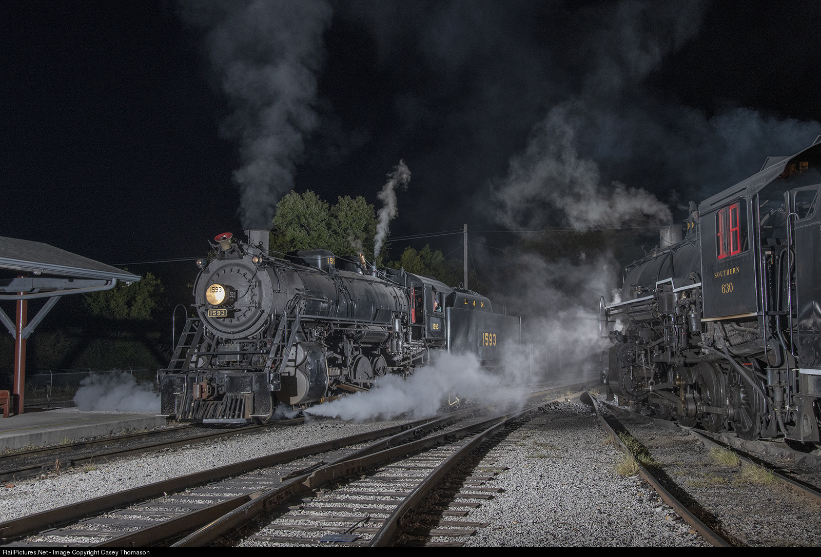 | L&N J-3 #1593 meets Southern 630 at East Chattanooga. In support of the 2019 L&N Historical Society convention being held in Chattanooga, Tennessee Valley Railroad Museum made some cosmetic changes to Southern 4501 to give it an Old-Reliable appearance. |