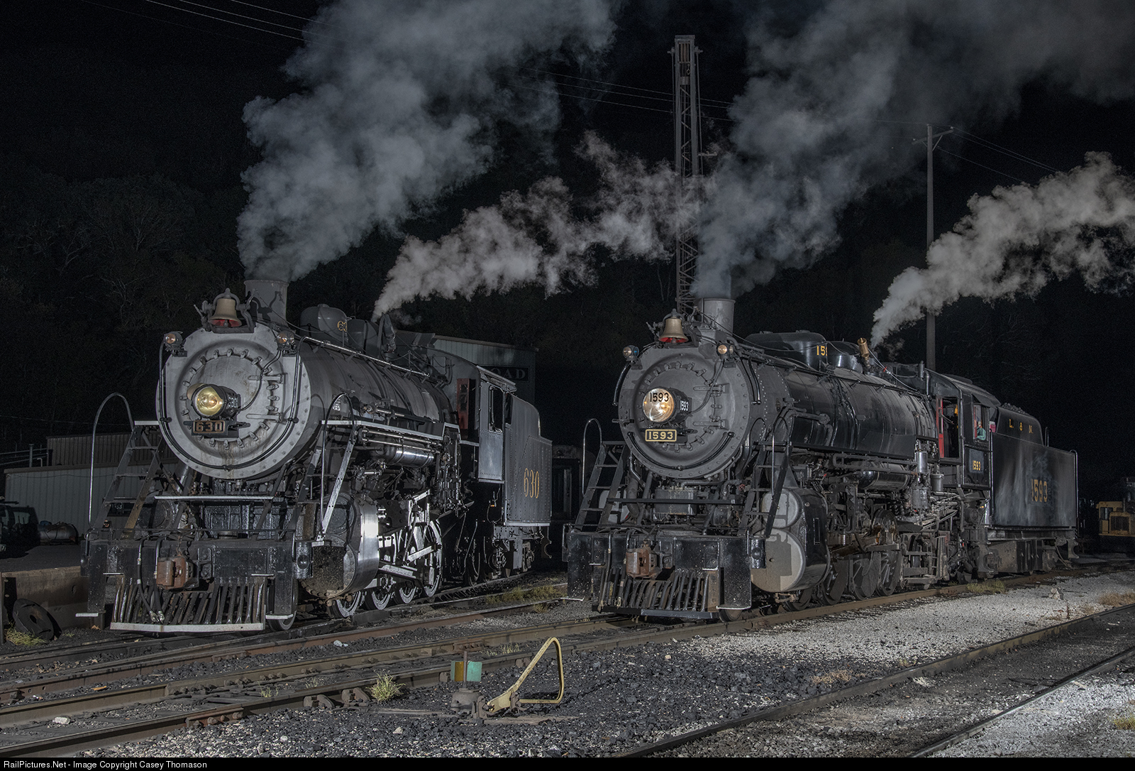 | In support of the 2019 L&N Historical Society convention being held in Chattanooga, Tennessee Valley Railroad Museum made some cosmetic changes to Southern 4501 to give it an Old-Reliable appearance. Here you can compare the schemes and jewelry of the two roads as "L&N J-3 #1593" poses next to Southern 630 at East Chattanooga during the Society's night photo session. |