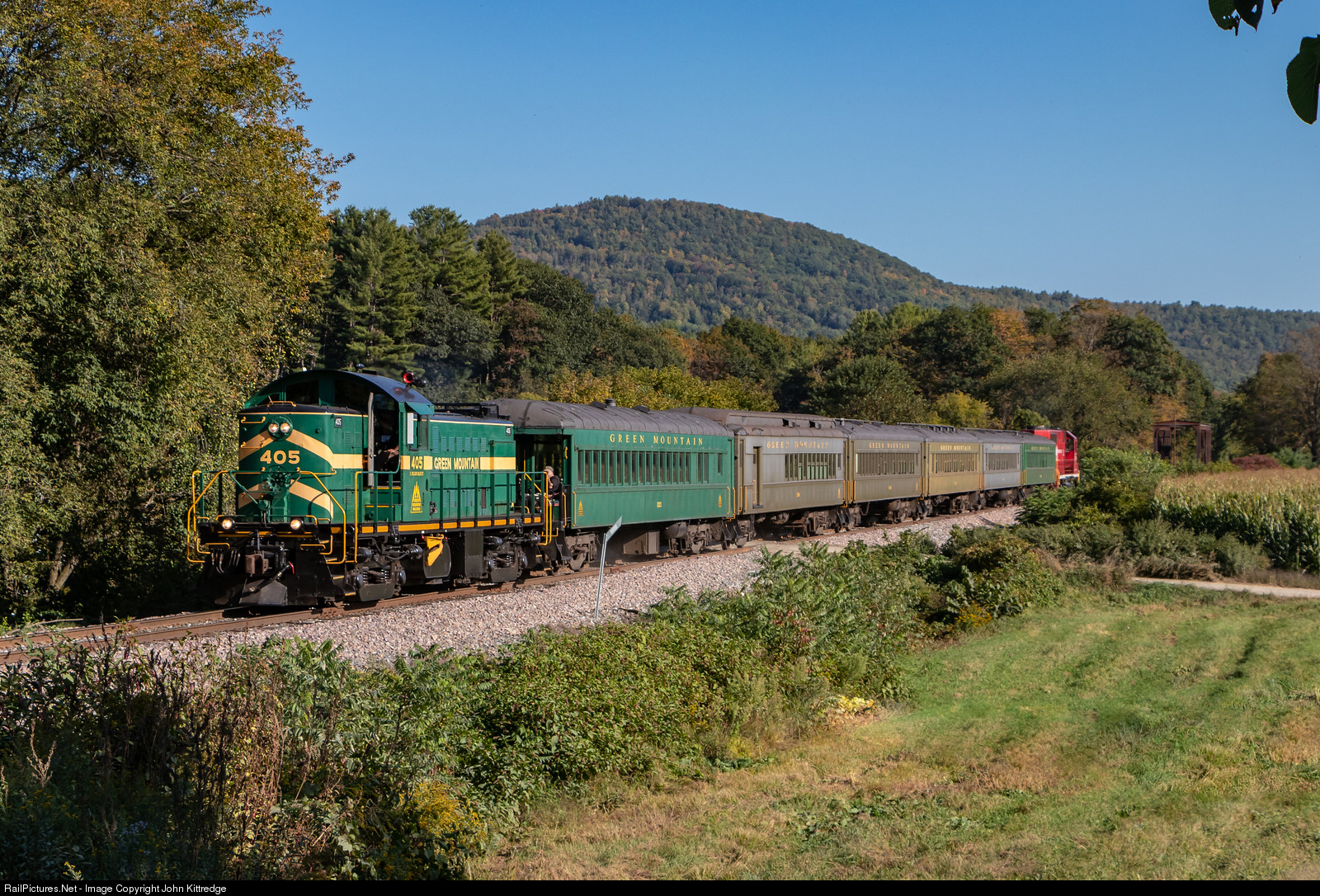 Former Rutland Railroad RS1 #405 leads Green Mountain Railroad's Fall Foliage excursion train back toward Chester Vermont on a beautiful September afternoon
