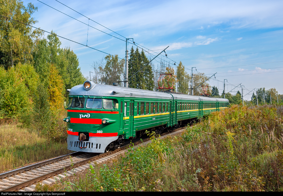 | One of the last green USSR colors ER2K-980 EMU train runs from Aprelevka to Obninsk. The electric train was built in 1972. This type of electric train is distinguished by the round shape of the head cars. This design was trendy in the middle of the 20th century and now is very revered among railway fans. Currently, there are only few trains with such design in Russia. |