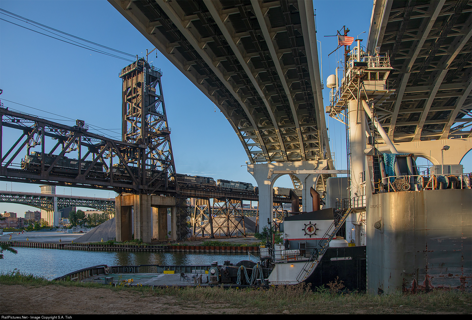 As the tug Defiance with the barge Ashtabula works on offloading stone, a westbound NS freight flies under the Innerbelt bridges and across the Cuyahoga on bridge NS2