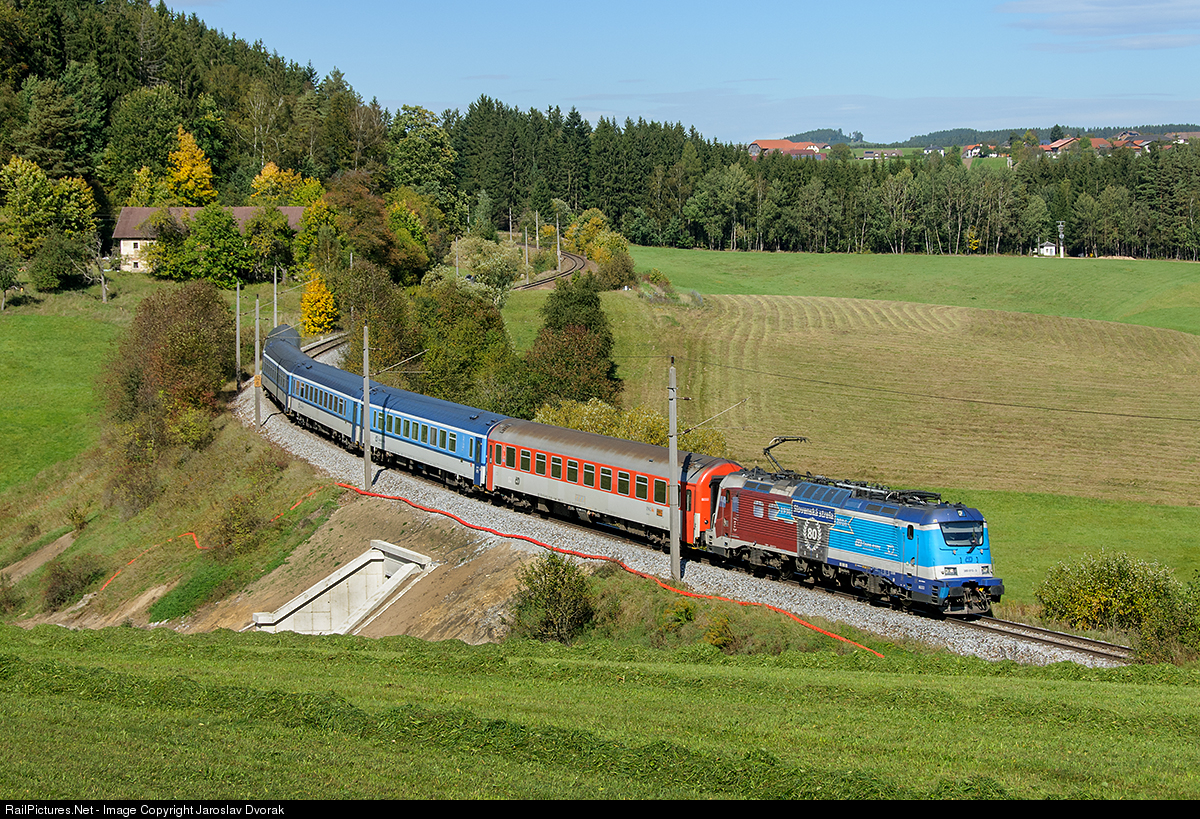 An unusual annual design was given to the locomotive 380 013-3. This happened on the occasion of the 80th anniversary of the launch of the comfortable express connection Slovenská strela between Bratislava and Prague. Captured at the head of an express train from Prague to Linz between Summerau and Freistadt
