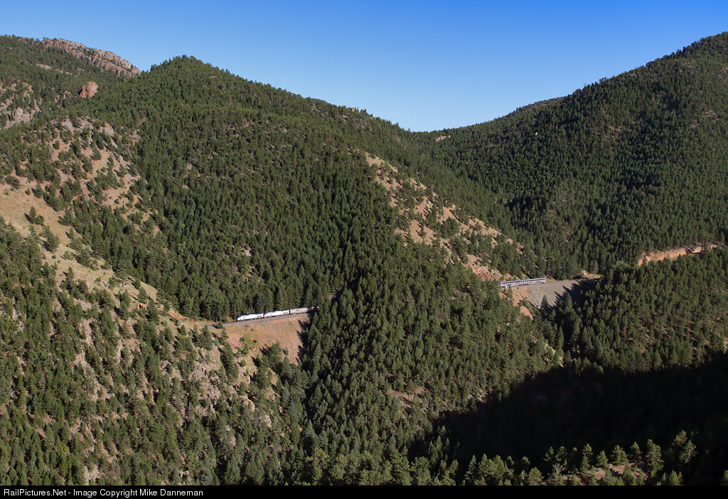Amtrak’s eastbound California Zephyr drops downgrade drops downgrade east of Crescent, Colorado, on August 28, 2019. The train is passing through Tunnel No. 15 and is about to enter Tunnel No. 14 in South Draw.