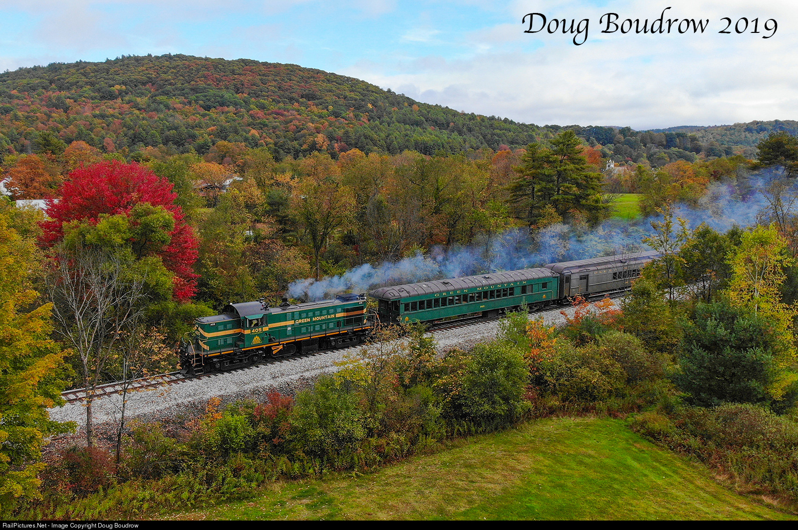 | On the second and longest run of the day, Green Mountain Rail Company 405, a 1951 ALCO RS-1 originally built for the Rutland Railroad leads a train North out of Chester, headed for Ludlow and return. The 405 has been running the rails in Vermont since it was built and is the only one of its class remaining active in the state.