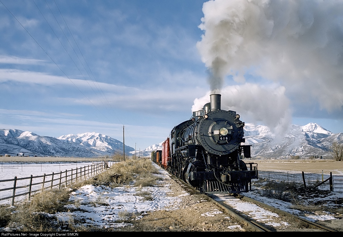 Steam Locomotive No. 618 is one of the stars of the Heber Valley Railroad locomotive fleet. This historic engine, which turned 100 years old in 2007, has been pulling tourists through the Wasatch Mountains since 1971. At one time there were over 1000 locomotives like it working for the Union Pacific Railroad, which took delivery of its first 2-8-0 in 1868. They were first used on the steep grades in Wyoming Territory in main line freight service, though they proved very adept at just about every task, be it yard switching to fright service to passenger duties. This type of engine was such a standard type of fright locomotive that nearly all major railroads owned dozens of them, and practically all smaller railroads had at least one on the roster. The 2-8-0 is a very versatile design in that a locomotive the size of the No. 618 could pull, by itself, a freight train of fifty or sixty freight cars over level track, or it could be double-headed with another locomotive for heavier train or steep grades. Although not specifically designed as a passenger engine, many smaller rail lines used them for that purpose. No. 618 started life in the erecting halls of the Baldwin Locomotive Works at Eddystone, Pennsylvania in July 1907. The 2-8-0 was part of a three locomotive order from the Oregon Short Line Railroad (a subsidiary of the Union Pacific) built that month by Baldwin and numbered 1066-1068. The OSL, which had roots back to the narrow gauge Utah Northern, ran from northern Utah and into Idaho, Wyoming and Montana. It survived the bankruptcy of the Union Pacific in the late 1890s because of its status as a separate company. Mechanically speaking, the No. 618 is equipped with 22″ X 30″ piston valves, Stevenson valve gear, 57-inch drive wheels, and a superheated boiler. Its boiler has 286 fifteen-foot tubes, and a working pressure of 200 PSI. Working for the OSL the No. 1068 was employed mainly in freight service, most likely in northern Utah and Southern Idaho on the main line to Pocatello. Its early years are clouded in mystery, but we do know that when the Oregon Short Line locomotives were numbered into the UP system around 1915, the No. 1068 became Union Pacific No. 618 (it was still designated an Oregon Short Line locomotive, evidenced by the “O.S.L.” initials on the sides of the cab and the rear of the tender.) It was classified as a “C-57” – “C” for Consolidation and “57” designating its 57-inch drive wheels. No. 618’s last major shopping while on the Union Pacific was at the railroad’s, Pocatello, Idaho shops in 1941. At that time it received all new tubes and flues, wheel and running gear work, and a complete renewal of worn parts. Around that time its square tender was replaced with a Vanderbilt model (the same tender it has today) that holds 9,000 gallons of water and 15 tons of coal. After this No. 618 went to work around the Ogden, Utah area; during this time its home was a stall in the UP’s Ogden roundhouse. During World War II it was often used on the track running between the Ogden yard and the Defense Depot Ogden (an Army storage facility north of the city) hauling equipment and supplies desperately needed for the war effort. After 1945 and the end of the war, No. 618 was sent to northern Utah and assigned to the Union Pacific’s Cache Valley Branch between Mendon and Logan, and also saw service on the Malad line. By 1955 diesels had rendered it obsolete, and it served its last years working at Ironton, moving bottle cars of molten iron to the Geneva Steel plant. In 1958 the No. 618 was donated to the State of Utah, and placed on display at the Utah State Fairgrounds in Salt Lake City. It sat there until 1970, when the land it occupied was needed for expansion. But how to remove it from the fairgrounds? Legend has it that one idea was to dig a hole and bury it, and that this came close to happening! Fortunately, a local railroad club – the Promontory Chapter of the National Railway Historical Society – intervened and saved the engine. Their members convinced the State of Utah to donate the engine to their group, for use on the Heber Creeper operation then being started at Heber City. It was moved to Provo, then steamed up and run under its own power through Provo Canyon to Heber City in December 1970. From that time on, No. 618 was a regular attraction at Heber City. It pulled the Heber Creeper from 1971 until 1976, then again from 1986 until 1990. During that time the Promontory Chapter owned the engine and leased it to the Wasatch Mountain Railway. In 1992, the locomotive was donated to the State of Utah for use by the Heber Valley Historic Railroad, and in June 1992 it was towed from the old property to the new Heber Valley railroad yard. For several years the No. 618 sat idle. After two decades of service, the 2-8-0 needed a complete overhaul before it could run again. It sat on static display near the Heber station until the end of 1993, when the Heber Valley’s new state-of-the-art restoration shop was completed. Between 1994 and 1995 it was completely overhauled inside the new building, and then debuted with fanfare on May 13, 1995, pulling the first train of the ’95 season to Deer Creek Dam and back. Over the years the engine has starred in movies and television programs, pulled the Olympic flame, and has been the subject of numerous magazine and newspaper articles. In celebration of its 100th birthday in 2007, it was temporarily relettered as Oregon Short Line No. 1068, the historic locomotive’s first number. Source: Heber Valley Railroad Internet homepage.