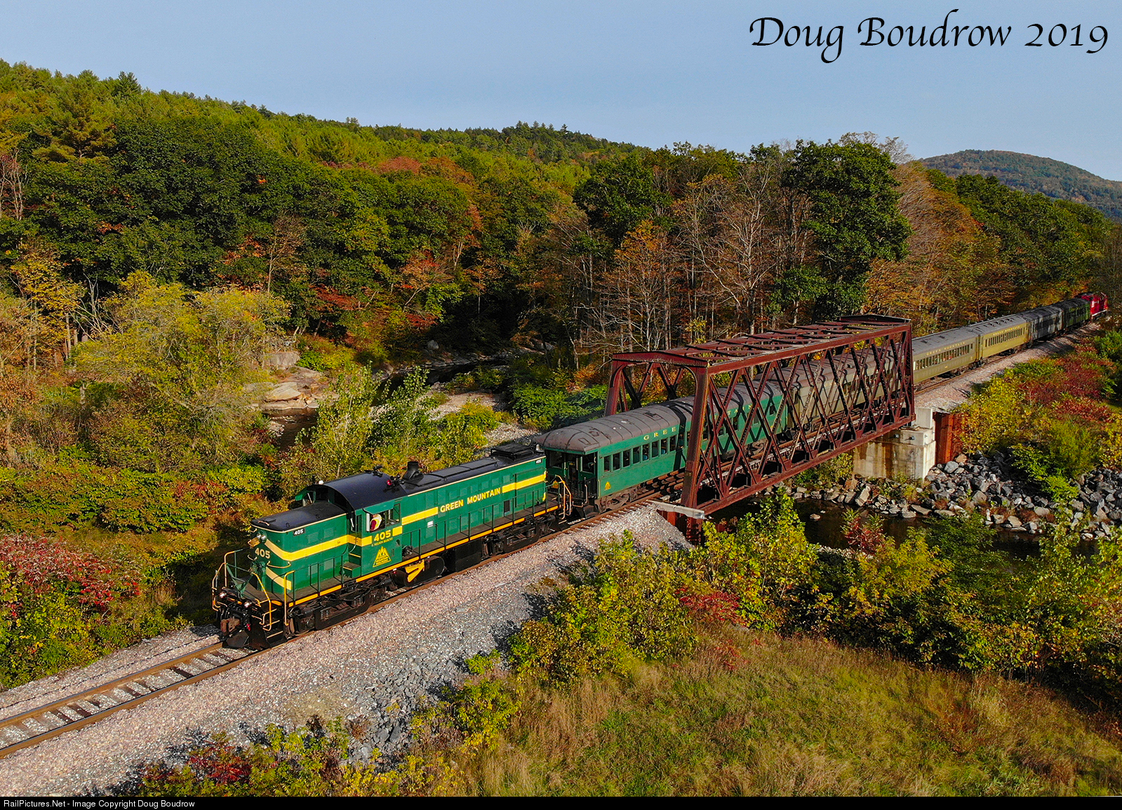 | On the final run of the day, Green Mountain Rail Company 405, a 1951 ALCO RS-1 originally built for the Rutland Railroad leads a train north out of Rockingham headed back to Chester. The 405 has been running the rails in Vermont since it was built and is the only one of its class remaining active in the state.