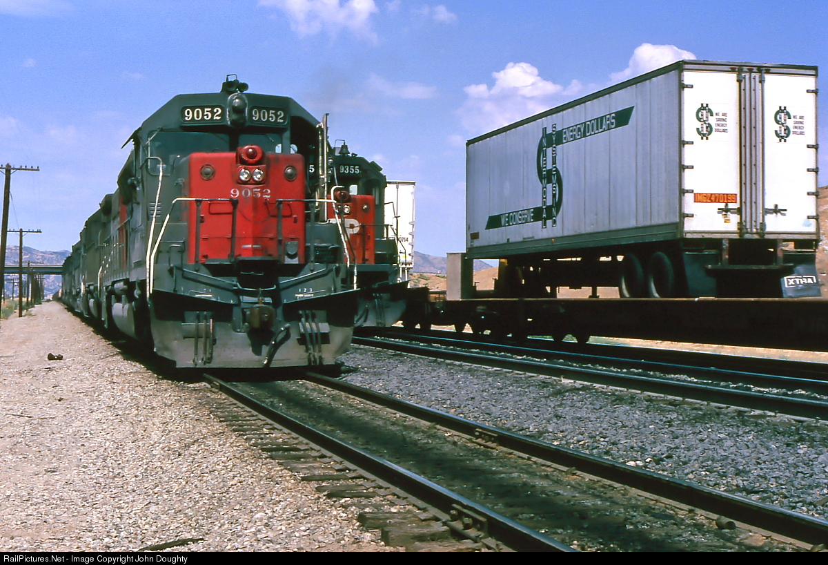 As a Santa Fe intermodal train races west on the main line, the helper set, led by Cotton Belt 9355, slowly heads west down the helper spur. On the middle track is SP 9355, which is starting to pull its train east as it begins to head down hill towards Mojave.