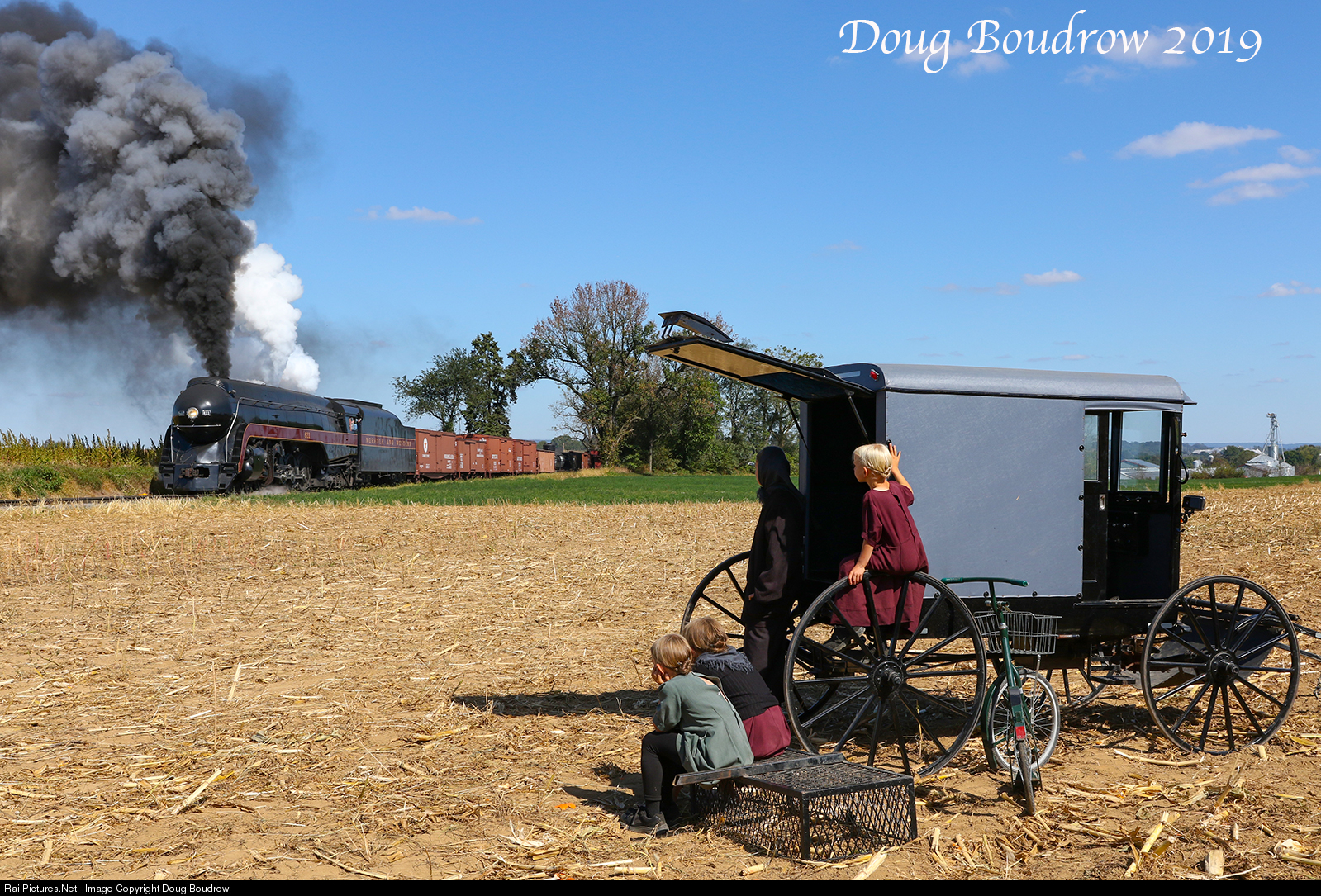 As part of the "Norfolk & Western Reunion of Steam" event, a photo charter was planned using Strasburg Rail Road owned Norfolk & Western 475 and visiting locomotive Norfolk & Western 611. The 611 was pulling a freight train as it did in its final days of service. In this scene, a local Amish family has stopped their buggy to watch the train pass.