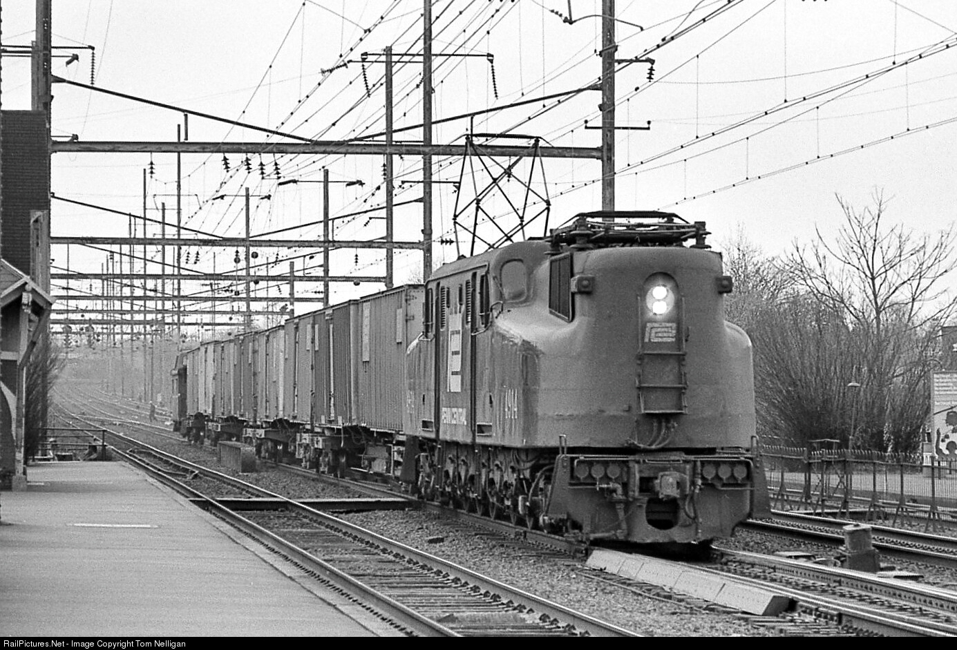 Flexi-Vans were an early form of intermodal containerized freight handling that was adopted in the 1960s by the New York Central and a few other railroads, utilizing specialized highway boxes and flat cars. Following the Penn Central merger they started showing up on ex-PRR lines as well. This GG-1 raced north with a string of Flexi-Vans on the Northeast Corridor at Iselin, NJ.