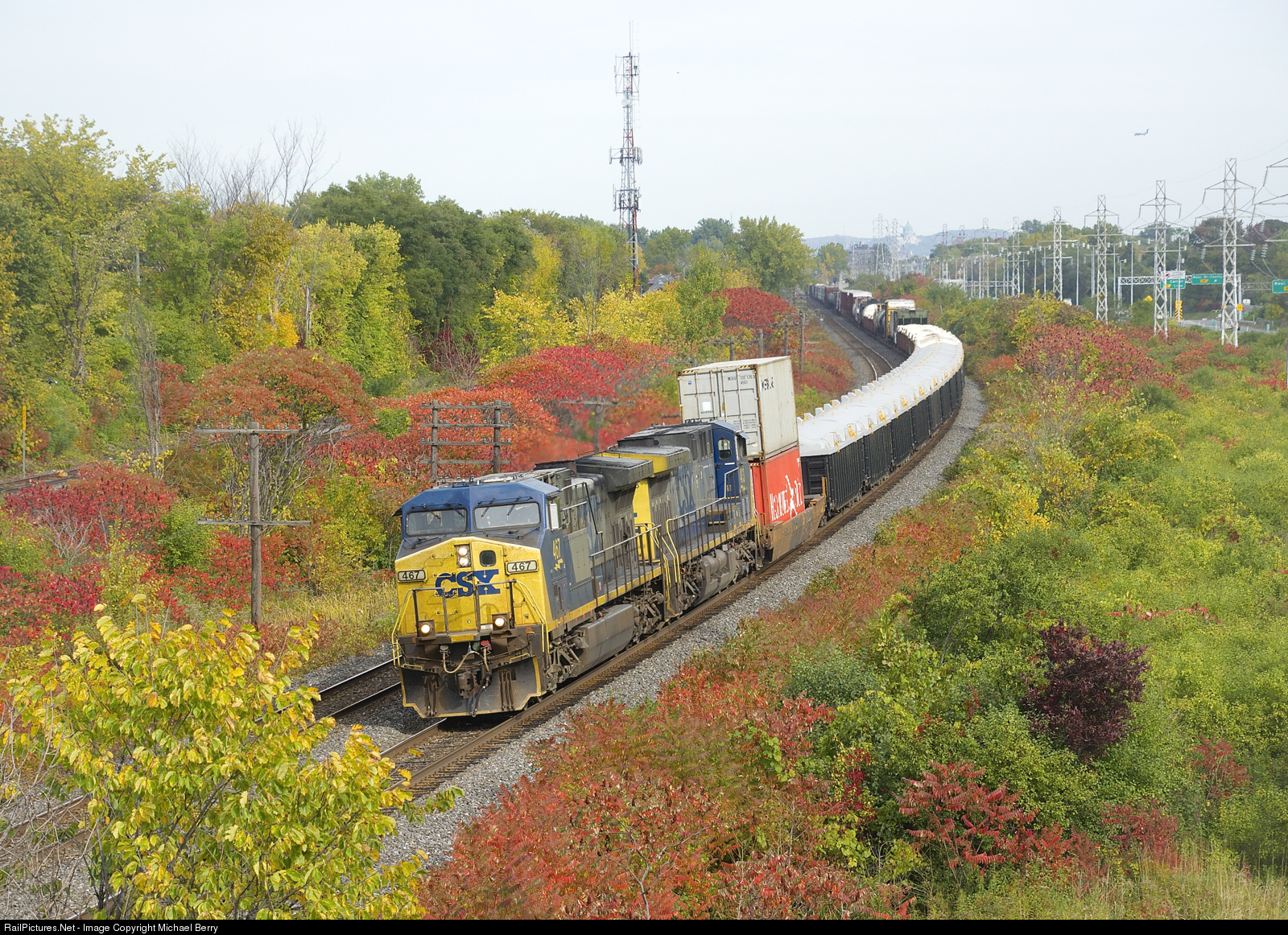 New intermodal service. With a pair of AC4400CW's in the increasingly rare YN2 paint scheme (CSXT 467 & CSXT 483), CN 327 passes some nice fall colours as it heads west through Beaconsfield. The first car contains two containers bound for Philadelphia, part of a new CSX/CN intermodal service to/from Toronto and Montreal and Philadelphia, New Jersey and the New York City metropolitan area, which launched just this week.
