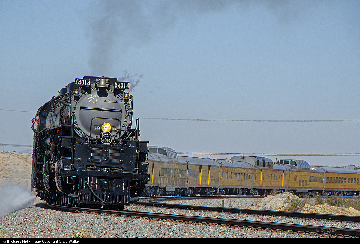 Union Pacific 4-8-8-4 4014 rounds the curve at the southern end of Oro Grande, California, as it approaches a scheduled servicing stop in Victorville, just about five miles further. The UP “Big Boy” is touring the southwestern United States on its “Great Race Across the Southwest” until November 27. (October 9, 2019)