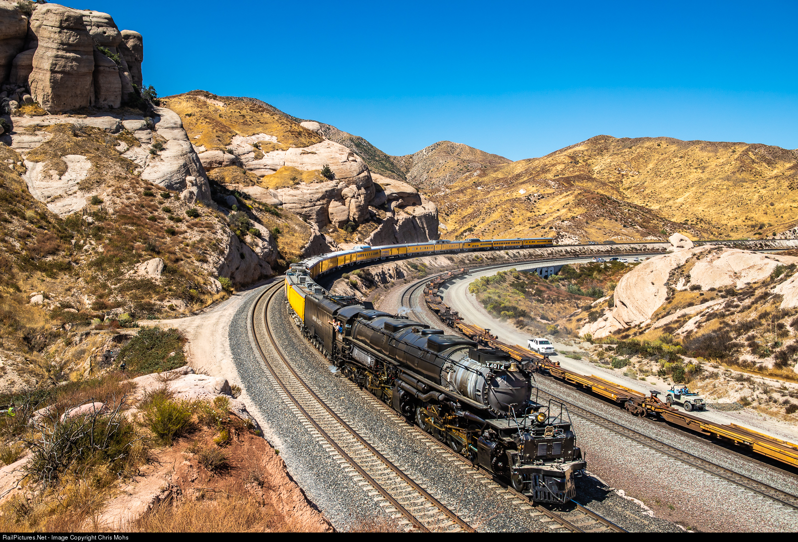 After Switching from BNSF rails to the UP Palmdale Cutoff at Silverwood, Union Pacific no.4014 slides westbound down grade to Colton in Southern California.The restored Locomotive looking good as it rounds through Sullivan's Curve in the hands of Engineer Ed Dickens and fireman Austin and all the members of the Steam Crew.