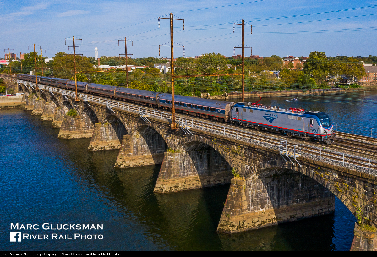On a beautiful afternoon of the first day of autumn, Amtrak Train 97 (Silver Meteor) rolls over the Morrisville–Trenton Railroad Bridge above the Delaware River on the afternoon of Monday, September 23, 2019, ACS-64 632 leading. This stone arch bridge was completed by the Pennsylvania Railroad in 1903 as part of a grade separation project.