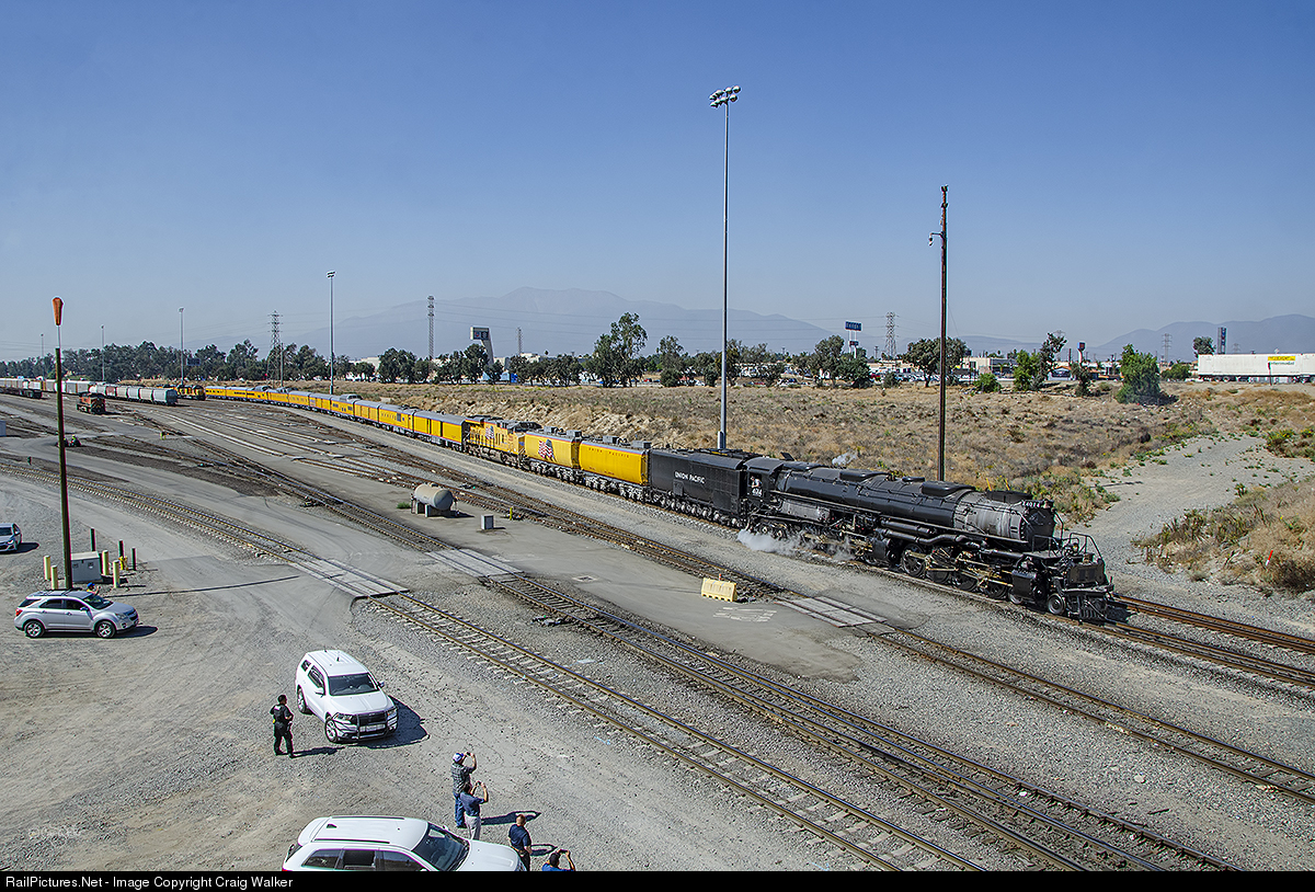Union Pacific 4-8-8-4 4014 has arrived at the railroad’s West Colton Yard and is backing its 10-car train down the mainline to the western end of the yard, and then will head straight into the yard for display on Thursday and Friday. On Saturday, October 12 this train will operate from here to Barstow, and the next day (Sunday the 13th) the train operates from Barstow back to West Colton Yard. (Colton, California – October 9, 2019)