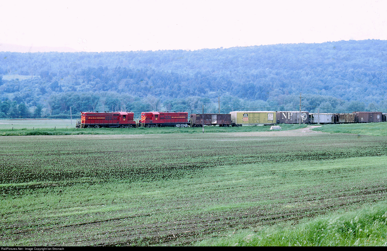 | On a hot and hazy day the SJ&LC's two GP-9's lead the daily westbound freight from St. Johnsbury to Morrisville. The SJ was a 95 mile bridge line between the CPR and MEC in St. Johnsbury and the Central Vermont in Swanton. The SJ dieselized with GE 70 Tonners, which by the mid-1960's were pretty worn out. The road then acquired two, ex-NYC GP-9's and five RS-3's. |