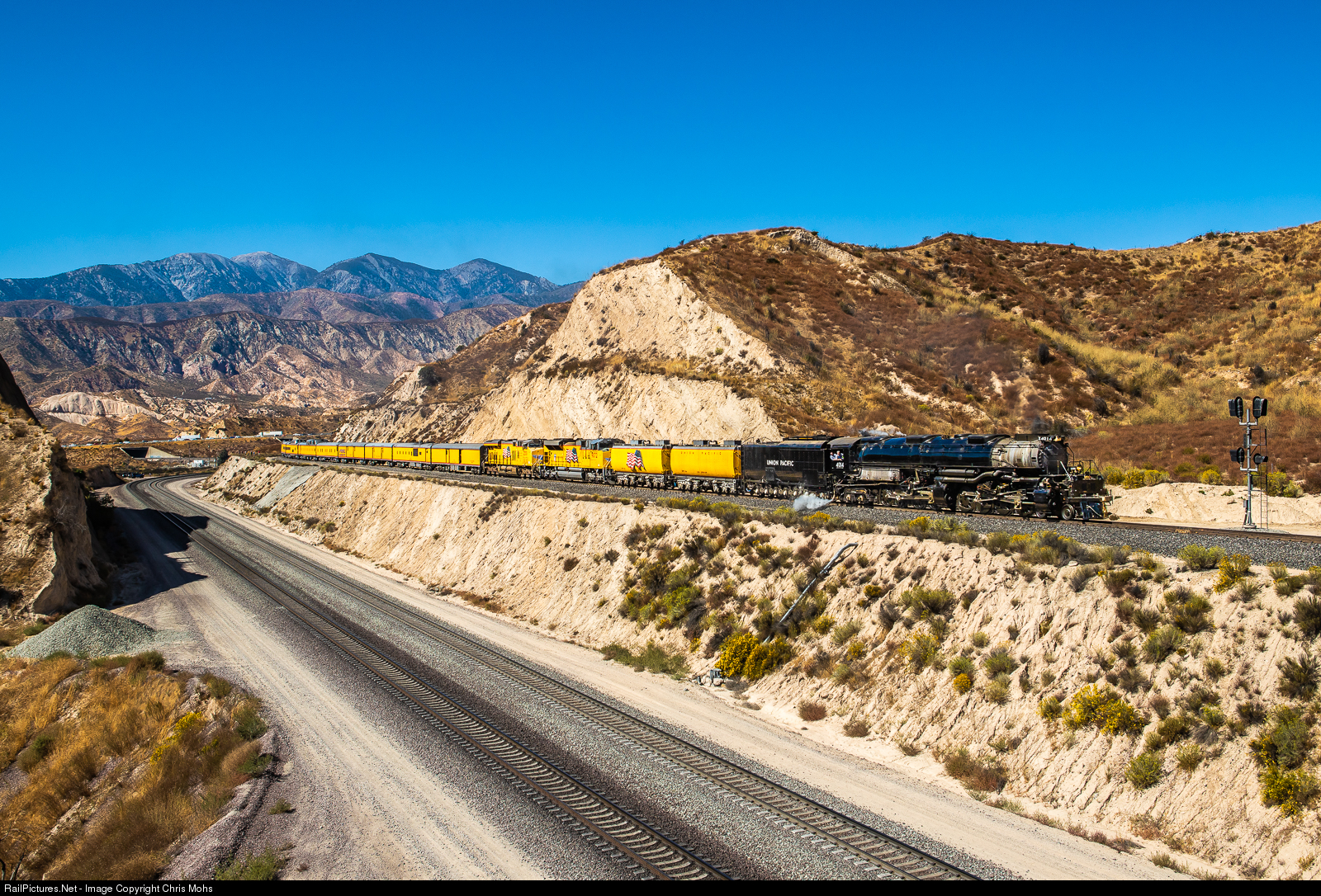 Union Pacific No. 4014 pulls the eastbound Rail giants Museum Excursion Train up the Hill around Alray and past the site of the old West Tunnel that was Daylighted in 2008. Quite the train with UP 4014, 2 extra Tenders, 2 Diesels, and 24 Baggage, Coaches, and Domes. I apologize if my count is wrong ,but i'm sure someone can supply the correct count.