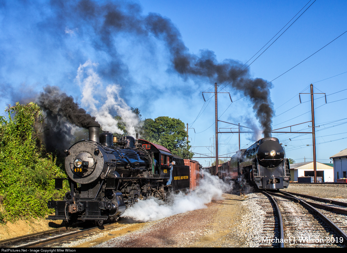 Engineman Mark Young is along for the ride as N&W M Class #475 coasts out of Leaman Place Junction while N&W J Class #611 simmers away on the siding awaiting clear boards west back to Strasburg, Pennsylvania.