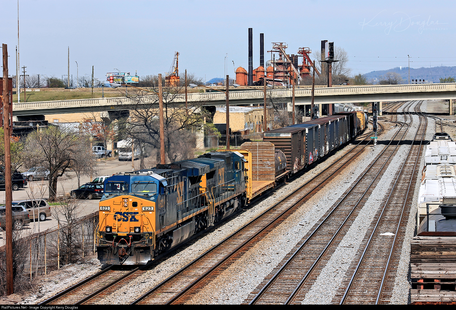 It's the afternoon hours in downtown Birmingham, and CSX Q689-29 (Birmingham,AL-Waycross,GA) has come around the curve, and clear the 24th St Block (MP-391.1 24th St.) on the Boyles Terminal. Running at 20 mph the southbound freight is about to cross the NS AGS South-End at 14th St. heading toward Hoover, AL. Once at Hoover, Q689 will get on the Lineville Sub and run east on it trek for Waycross, GA. Magic City is still a booming railroad, and industrial town, that truly takes pride in it's enriching heritage, note the top domes, and stack of the old Sloss Furnaces that tower over the east side Birmingham industrial district which is now part of a National Historic Landmark, of Birmingham's past. Since this photo was taken Birmingham is going through a renaissance where district are coming back to life with Museum's and Venues where tourist, and locals can come and visit.