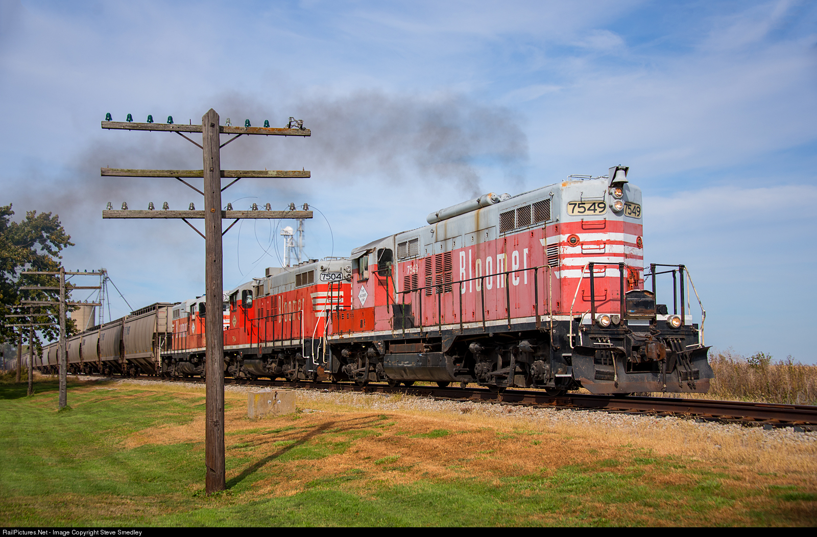 At 64 years old, Bloomer Line 7549 South blasts past old code line alongside the former Wabash mainline that once hosted the streamliner "Blue Bird", engineer Paul Jones, a 25 year veteran of the railroad, has his 40 car corn train well in hand. This was the first time in over two years that the 7549, a former Conrail GP10, x New York Central GP9 5943, has led a train on the mainline. ''Damn thing still runs good!'', said Jones of the oldest locomotive on the roster, built in October 1955. The train is shown at Strawn, Illinois.