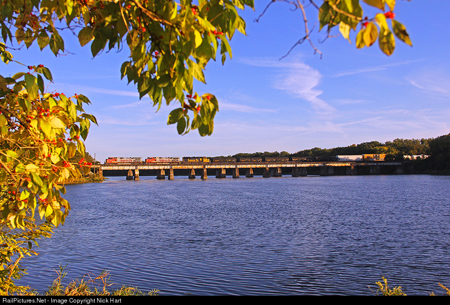 | Looking like a scene straight out of the 1990's, M GALCHI rolls east across the Kankakee River on a beautiful afternoon, with a pair of Warbonnet Dash 9's and a Bluebonnet GP50 providing the power. |