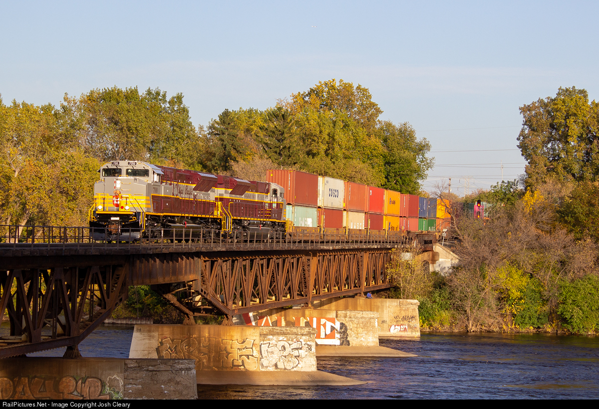 After picking up a cut of intermodal at Shoreham, CP 7010 and 7015 lead CP 197 over the Mississippi River on their inaugural revenue run.