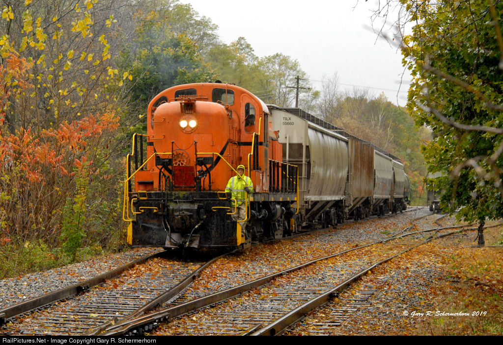 | On a cool wet Thursday, the young Battenkill crew pick up their interchange loads by Duan Lane as the rain showers saturates the October colors. |