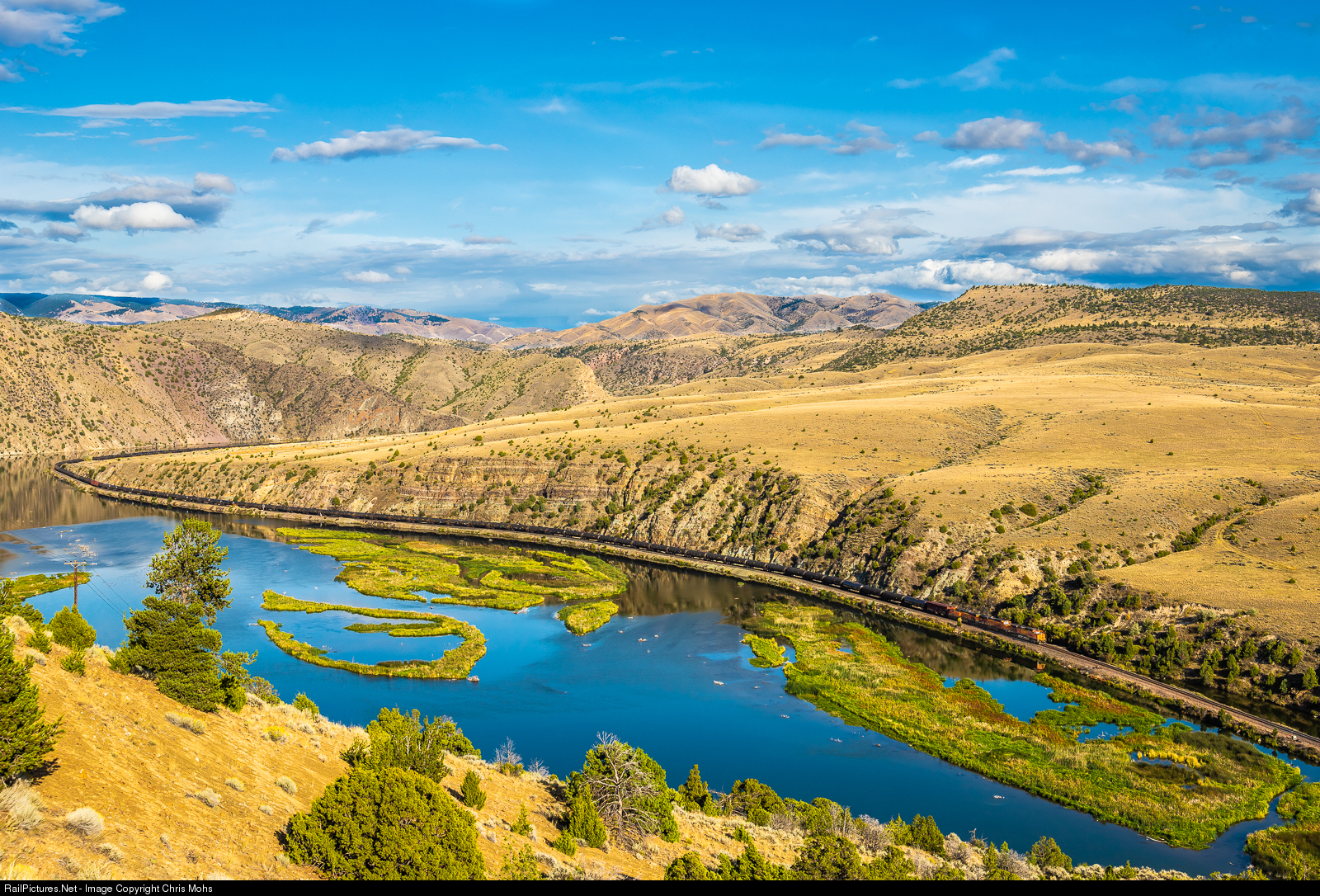 | Following the Missouri River and the Lewis and Clark Trail, a string of Cans makes it's way eastbound through the Lombard Canyon. |