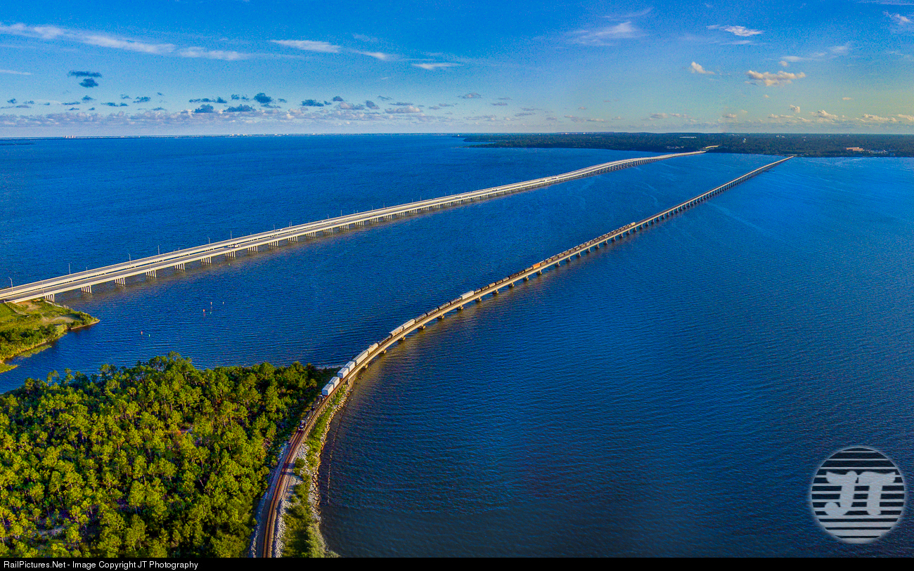 | Few things can make a freight train look small. The 11,370ft John T. Collinson Bridge is one of those things. Here FURX 7156 leads a freight east across Escambia Bay on the bridge en-route to Tallahassee.
