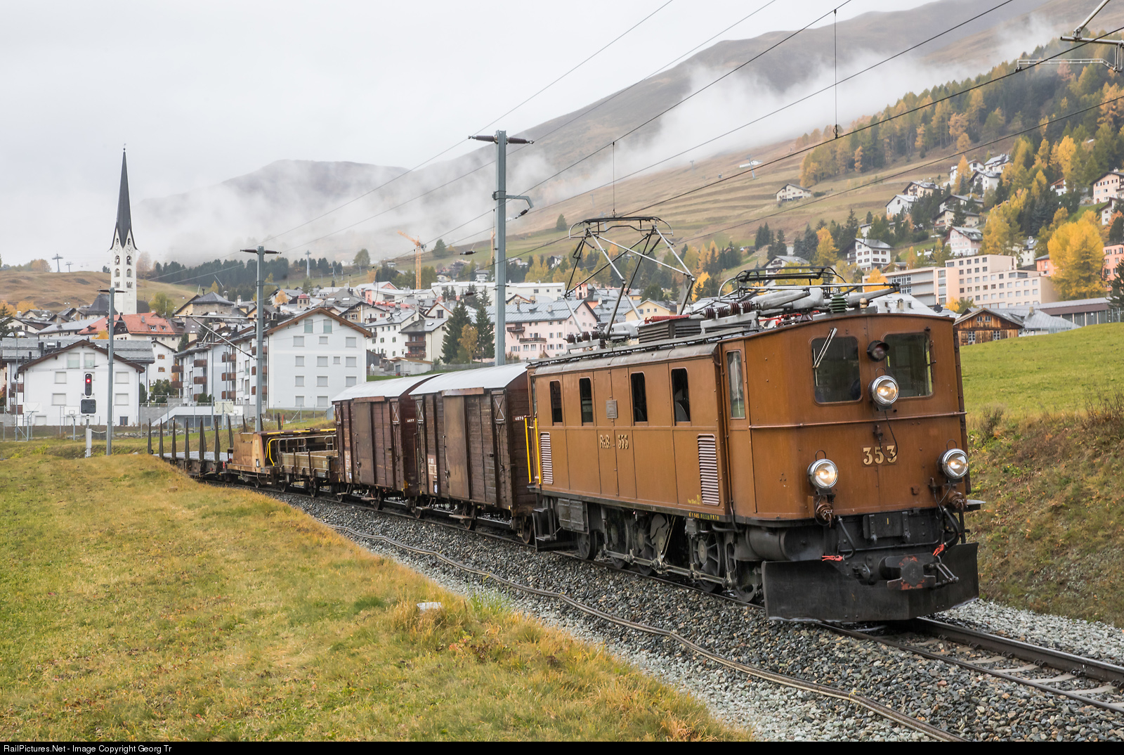 | Ge 4/6 # 353 of the Rhaetian Railway, built in 1914 by SLM and MFO for the Engadine line, left Zuoz shortly with a photo freight. |
